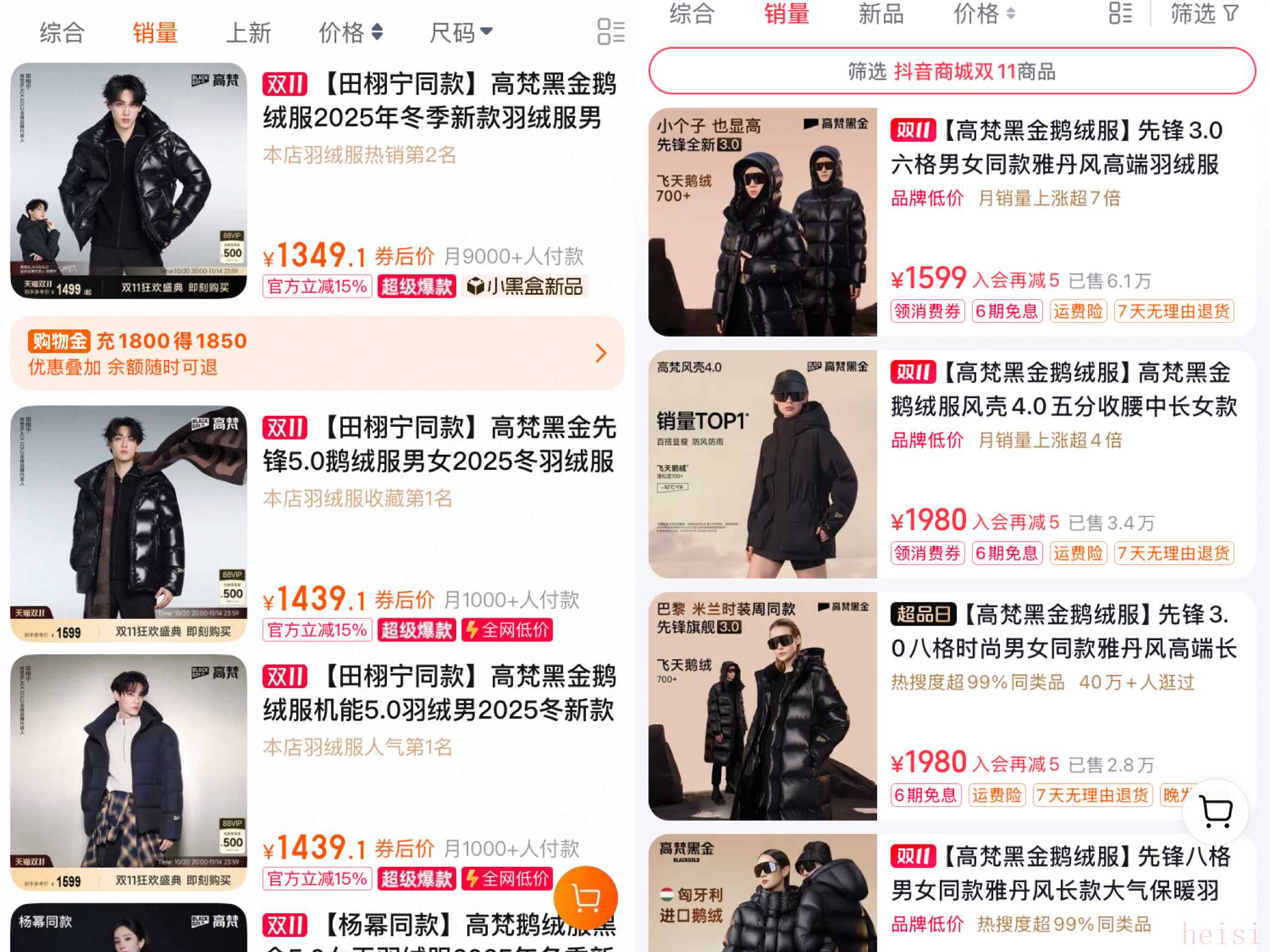 界面新闻在蝉妈妈平台搜索发现,抖音双十一大促期间,定价在1000元到2500元区间的羽绒服热销榜上,除高梵、波司登外,还有多款艾莱依、坦博尔、美力城的产品。艾莱依和坦博尔都是近些年翻红的老牌国货,美力城则是孵化自猫人集团的新品牌,三者都在近几年加大了营销力度。