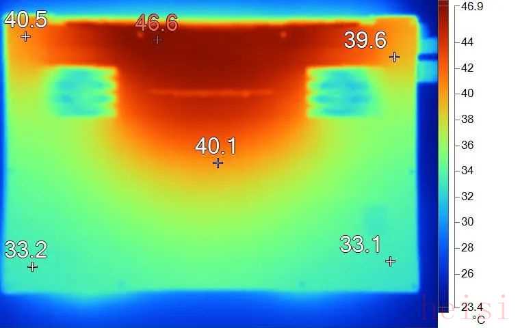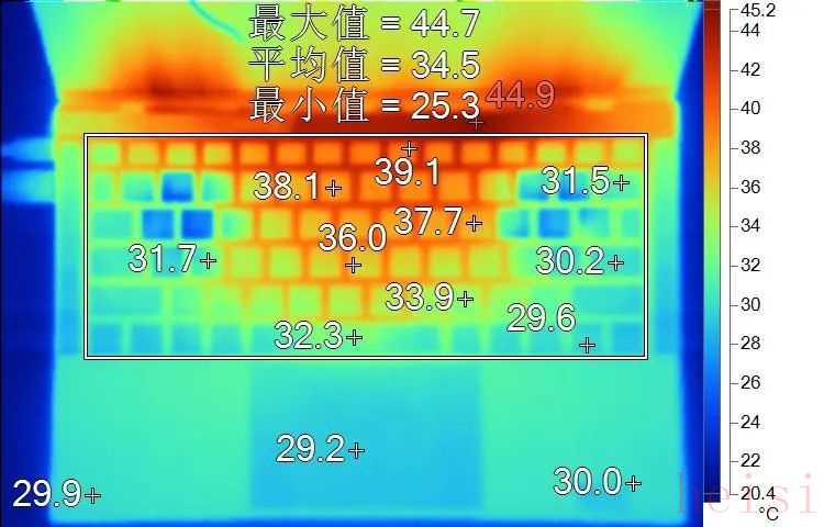 表面温度如上图所示,键盘键帽最高39.1℃出现在键盘数字键区域,WASD键为31.7℃,方向键29.6℃。左腕托温度为29.9℃,背面中心点40.1℃。