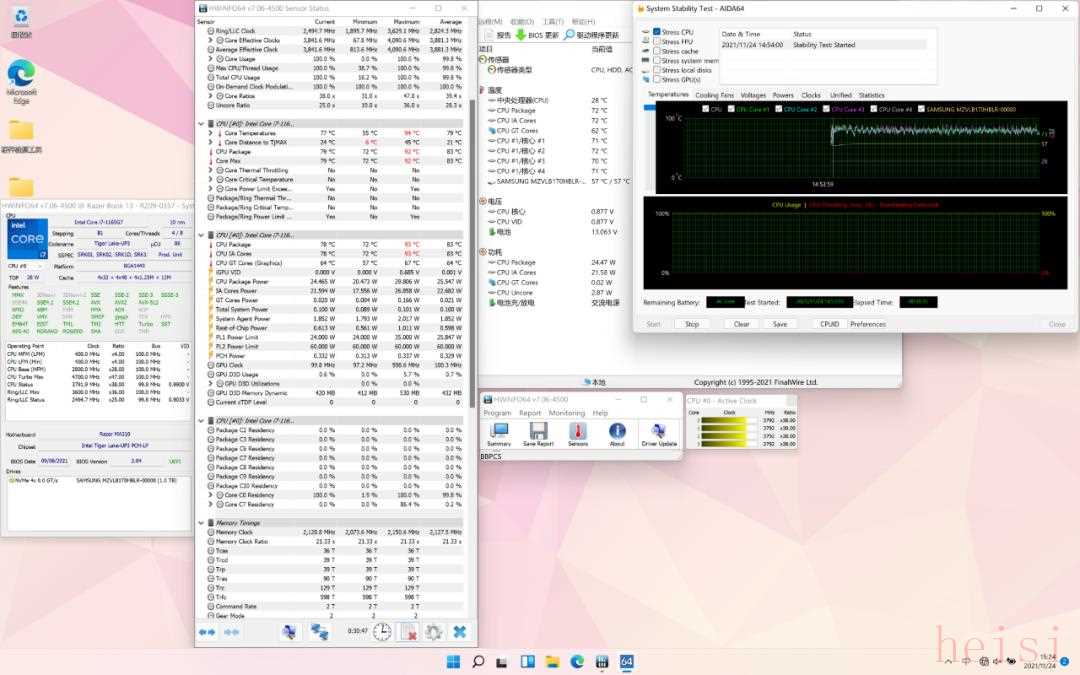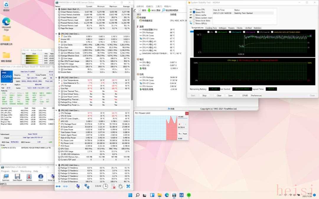 在满载状态下,CPU温度最高93℃,30分钟后在75~85℃浮动,功耗24~28W,频率3.7~4.1GHz。(4.1GHz为1165G7的全核最大频率)