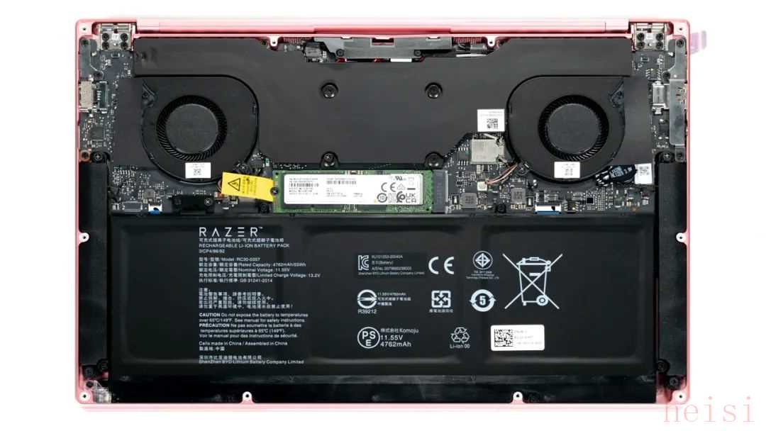 上图是RAZER BOOK 粉晶的拆机实拍图,双风扇加VC均热板的组合,在小尺寸轻薄本中很少见。