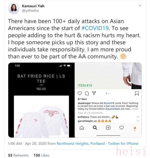 然而,这款衬衫却立刻遭到了包括华裔在内的大量亚洲和北美亚裔网民的抗议。很多人都指出,这种把亚洲人餐饮中常见的炒饭与携带新冠病毒的蝙蝠混在一起的“创意”,根本不是什么“幽默”,而是一种“种族歧视”,是在侮辱亚裔。其中不少华人网民更认为这是辱华。