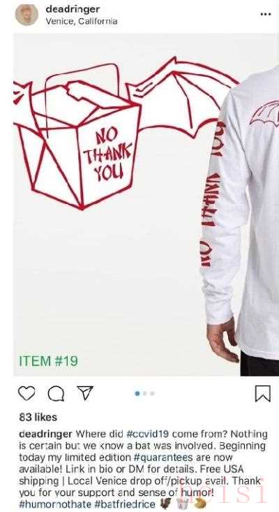 这个设计师之后在他的个人社交账号@deadringer上推荐了这款衬衫,并在一则网帖中写道:没人确定新冠肺炎从哪里来,但我们知道蝙蝠涉及其中….谢谢你们的支持和幽默感。