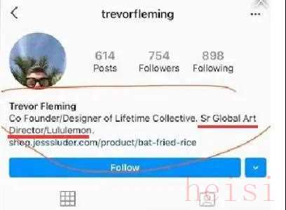 原来,就在那个美国设计师Jess Sluder在社交账号上推广这款涉嫌侮辱亚裔的衬衫时,他还@了Lululemon的全球艺术总监Trevor Fleming。而Fleming本人也在自己社交账号的简介中贴出了Sluder网店中“蝙蝠炒饭”这款衬衫的链接,似乎是在给他做推广。