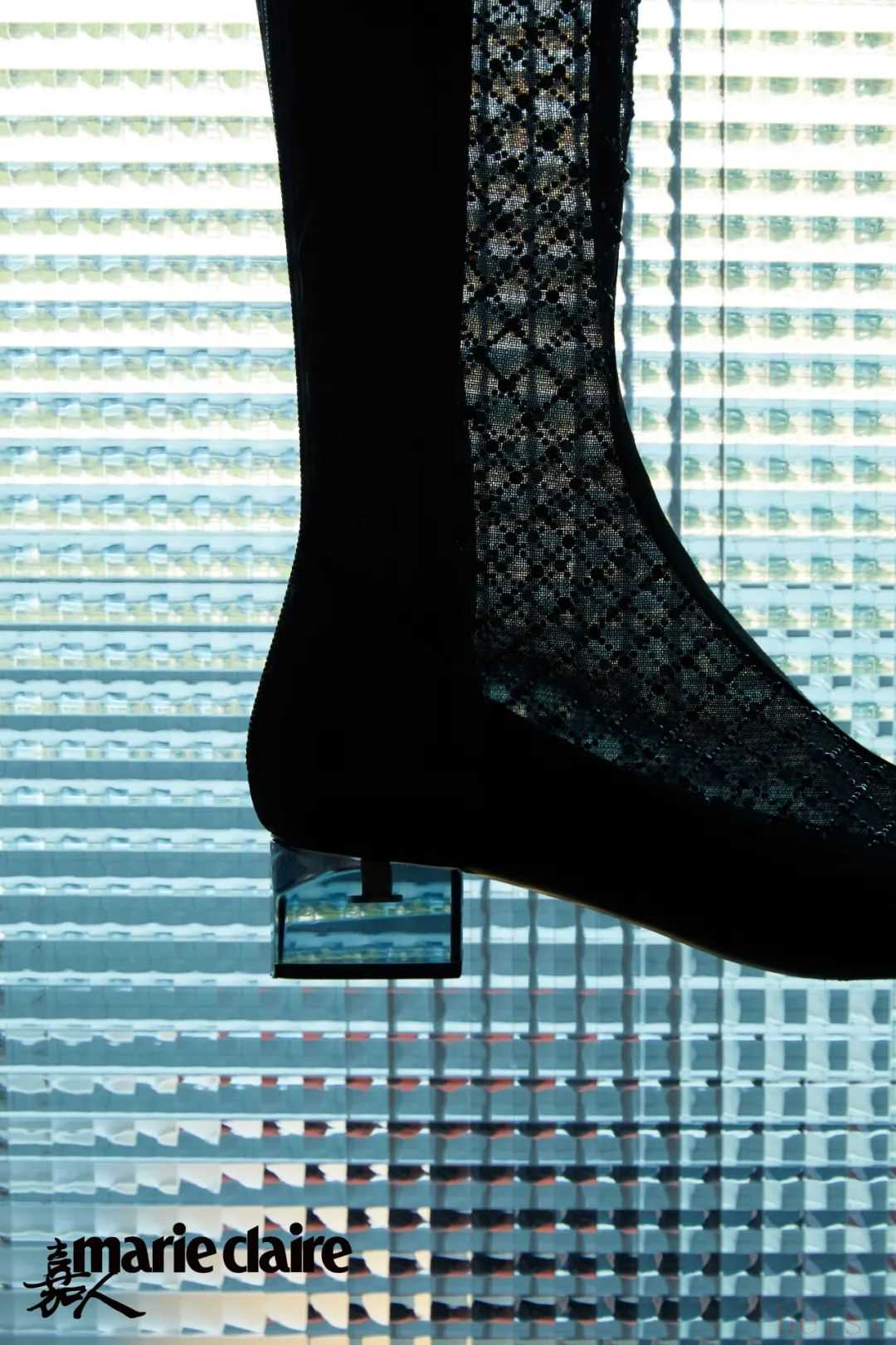 新款长筒靴子采用透气网面与麂皮混合的鞋面,搭配灵动晶莹的透明鞋跟,给日常优雅的装扮增添摩登气质。