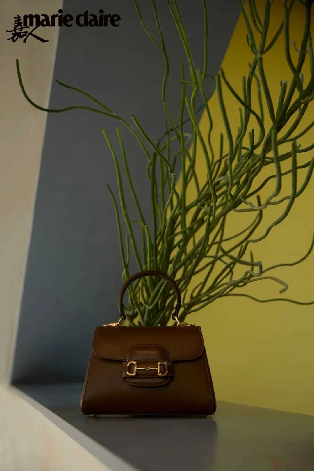 2022秋冬新款GUCCI HORSEBIT 1955手提包,用复古硬挺的梯形外观搭配品牌经典马衔扣,致敬五十年代包款。HORSEBIT马衔扣作为品牌的遗传密码,1953年GUCCI首次将双环扣搭配中间线条衔接的设计作为装饰性元素使用,如今马衔扣已经成为品牌标志性元素之一出现在各种产品上,传承着GUCCI的马术精神。