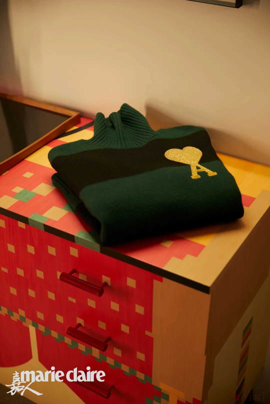 经典羊毛多色高领毛衣上的AMI DE COEUR图形是AMI最为深入人心的一部分,这一图案直译为“真心的朋友”,源自设计师ALEXANDRE MATTIUSSI在童年时期给朋友写卡片或留言时上的签名,记载友谊的图案象征AMI轻松、友好设计理念。