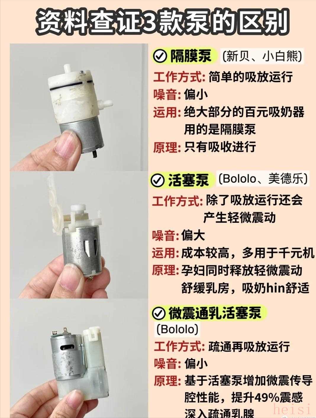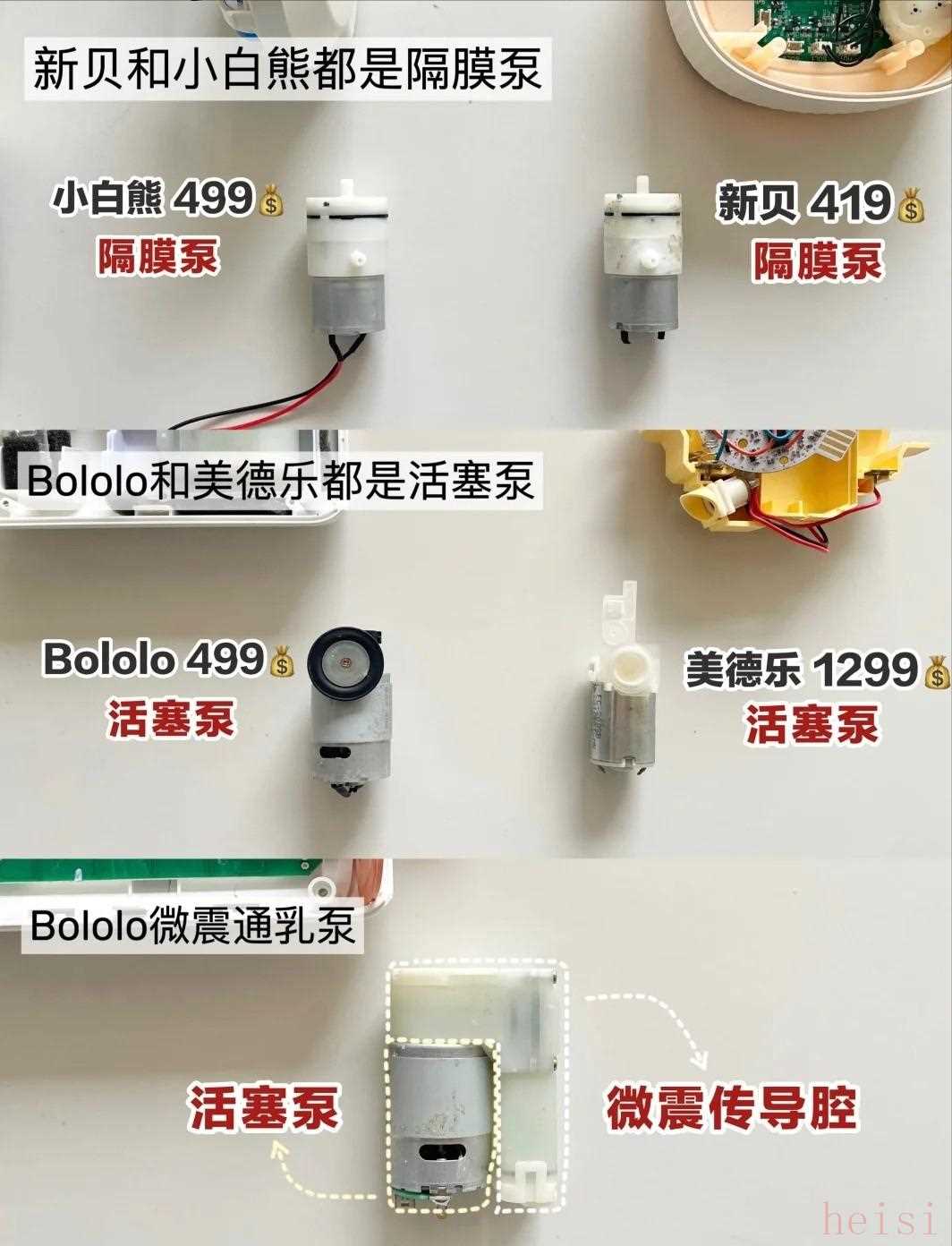 新贝和小白熊都是隔膜泵,美德乐是活塞泵,BOLOLO吸奶器是微震通乳活塞泵。