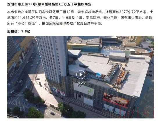 辽宁省拍卖行公众号近几年发布了多条有关拍卖信息。其中提到:沈阳市惠工街12号三万五千平整栋商业。本商业地产座落于沈阳市沈河区惠工街12号,曾为卓越精品馆。建筑面积35779.72平方米,土地面积11,635.20平方米。共7层,1-6层及-1层,钢混结构,商业用途,国有出让用地。单独所有“不动产权证”,按国家规定即时办理产权更名过戶手续。
