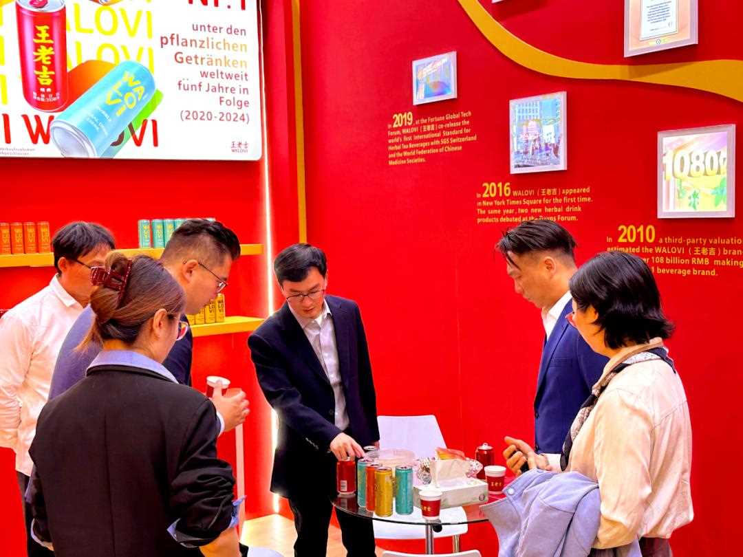 在Anuga展的展位上,四种口味的国际罐被精心陈列:洛神珠红款主打经典草本味,烟雨天青款加入气泡元素适配年轻群体,光明曦橙款瞄准无糖健康需求,琉璃耀金款则还原原味精髓。