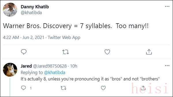 "华纳兄弟探索,7个音节,太多了吧!!”“实际上有8个哟,除非你只念bros,而不是全称brothers.”