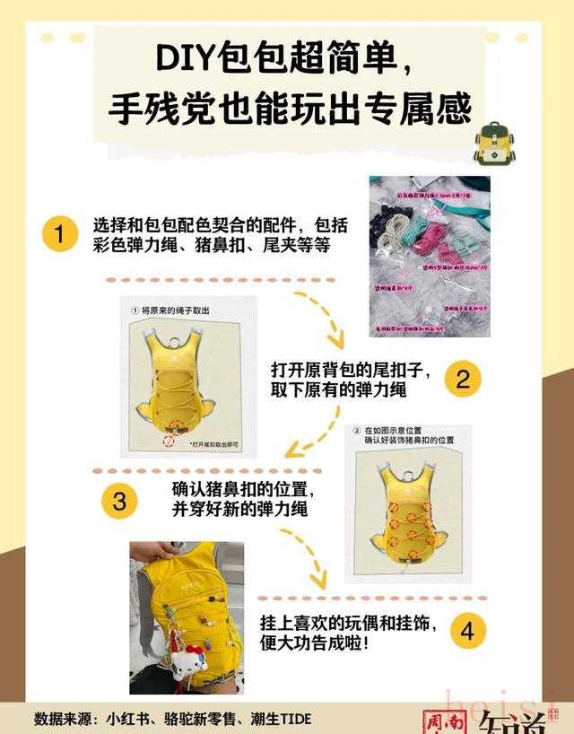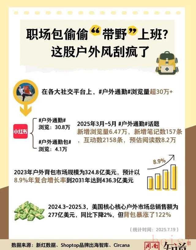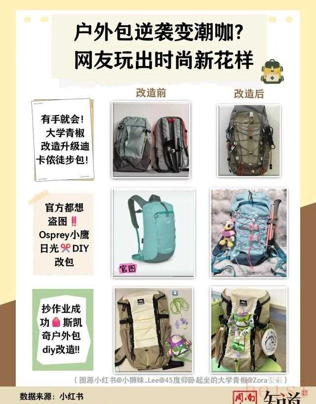 小红书#户外通勤#话题浏览破3.2亿,最火的是“织带外挂”:3M反光小挂件、个性魔术贴、3D打印笔架,背包变成“移动工位”。奢侈品logo是身份符号,户外织带是“自我插件”,后者天然带社媒流量。
