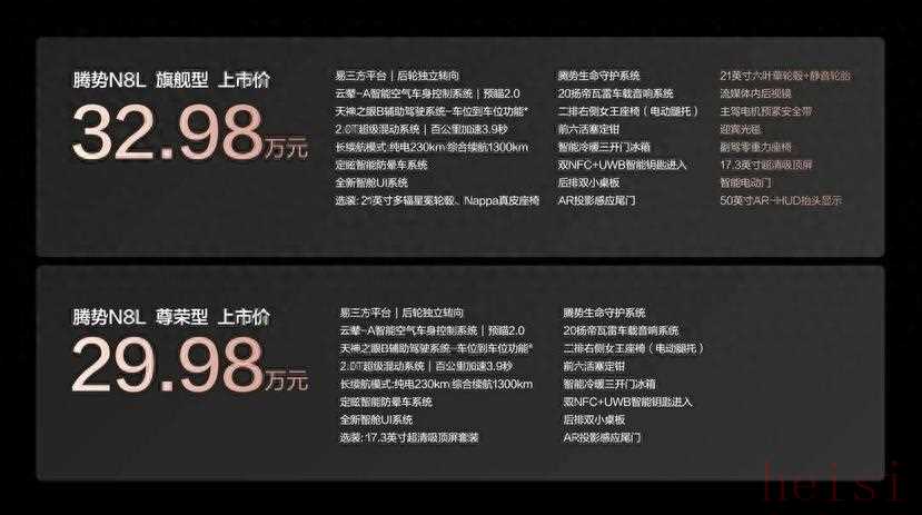 其实新车就有两个版本,低配29.98,高配32.98,简洁明了,有人说这价格稳了,乱杀问界M8与领克900,但通过许多消费者的对于N8L的定价与产品力反馈来看,也让N8L能否承担起腾势汽车走量任务存疑。
