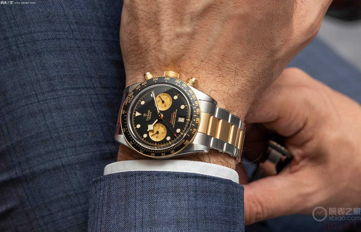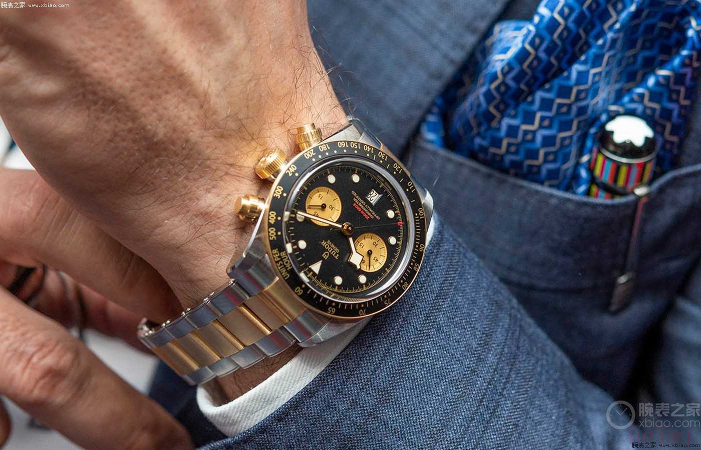 腕表点评:帝舵碧湾系列计时码腕表,巧妙融合了潜水腕表的硬核性能与计时码表的实用功能,最终打造出这款兼具强烈运动气息与复古韵味的作品。整个产品系列呢,关注度非常高,系列本身也提供了丰富选择,其中这只 “间金黄金眼” 更是表友口中的 “帝舵小怪兽”,人气常年居高不下。腕表表壳采用精钢打造,41毫米直径适配多数手腕,表壳表面经磨光与磨砂工艺交替处理,明暗质感对比鲜明;表侧表冠与固定外圈则选用黄金材质,外圈还镶嵌了黑色阳极氧化铝测速计字圈,复古中透着精致。