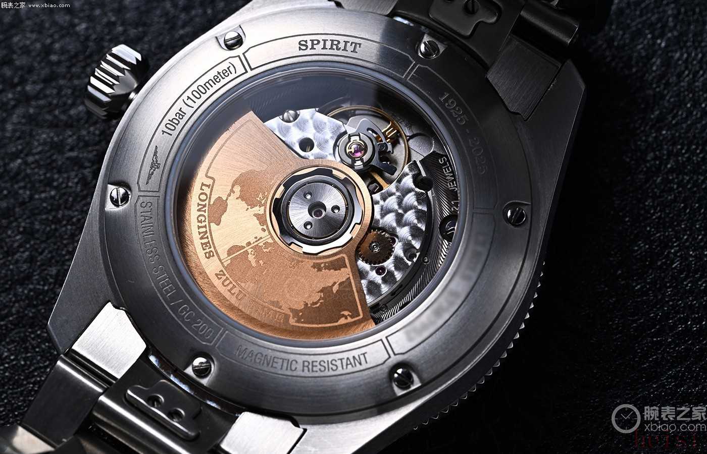 表壳采用精钢材质,以拉丝工艺为主,整体修饰没有过多花哨设计,但这份简单恰恰是为了衬托玫瑰金表圈的精致与奢华,让金圈成为视觉焦点。作为一款两地时腕表,先行者祖鲁时间少不了第二时区指示表圈,浪琴特意将其设计成玫瑰金样式,包金效果格外提气,“大金圈” 的辨识度一眼就能抓住人。黑色表盘以黑金双色为主调,最有特点的当属盘面上的五颗五角星。机芯方面,浪琴L844.4自动机芯,就是大家熟悉的L888机芯的两地时版本,配置很全面,双T避震器、硅游丝、72小时长动力储存一应俱全,还带有瑞士官方天文台认证,精准度与耐用性都有保障。