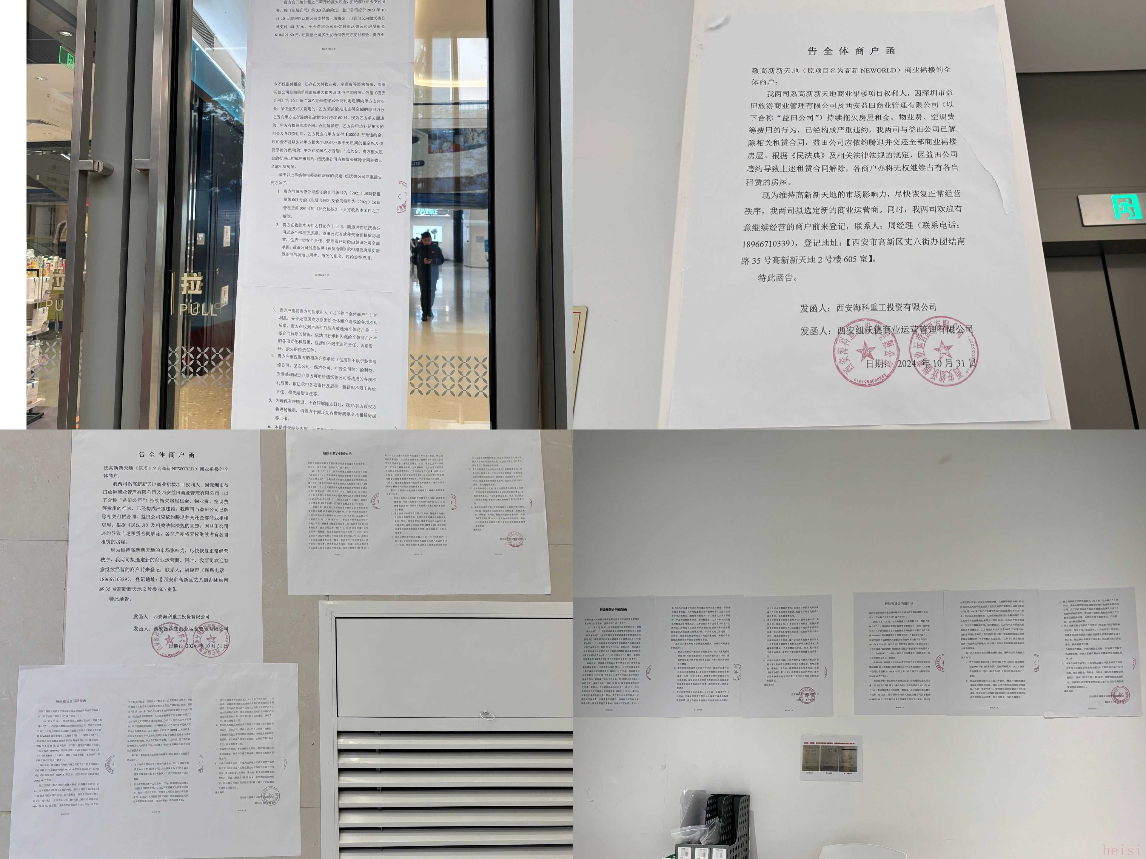 10月31日,西安益田假日天地项目权利人发布《告全体商户函》,明确指出目前运营方持续拖欠房屋租金、物业费、空调费等,造成严重违约,目前已解除相关租赁合同,对方应依约腾退并交还全部商业裙楼房屋。