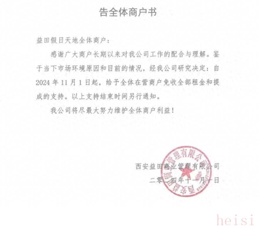 与此同时,西安益田商业管理有限公司(简称:西安益田)发布了一份《告全体商户书》,表示益田假日天地自2024年11月1日起,给予全体在营商户免收全部租金和提成的支持。