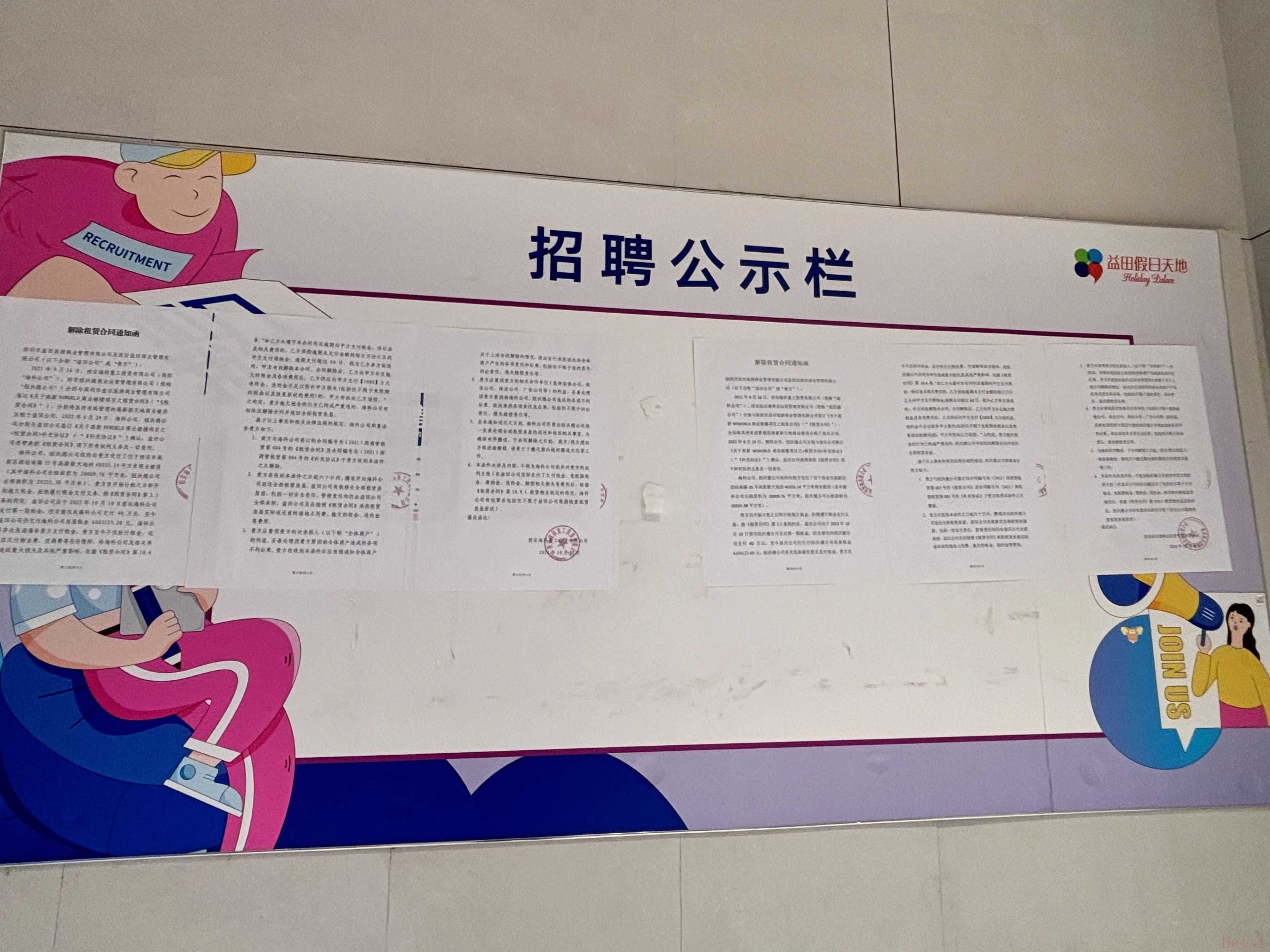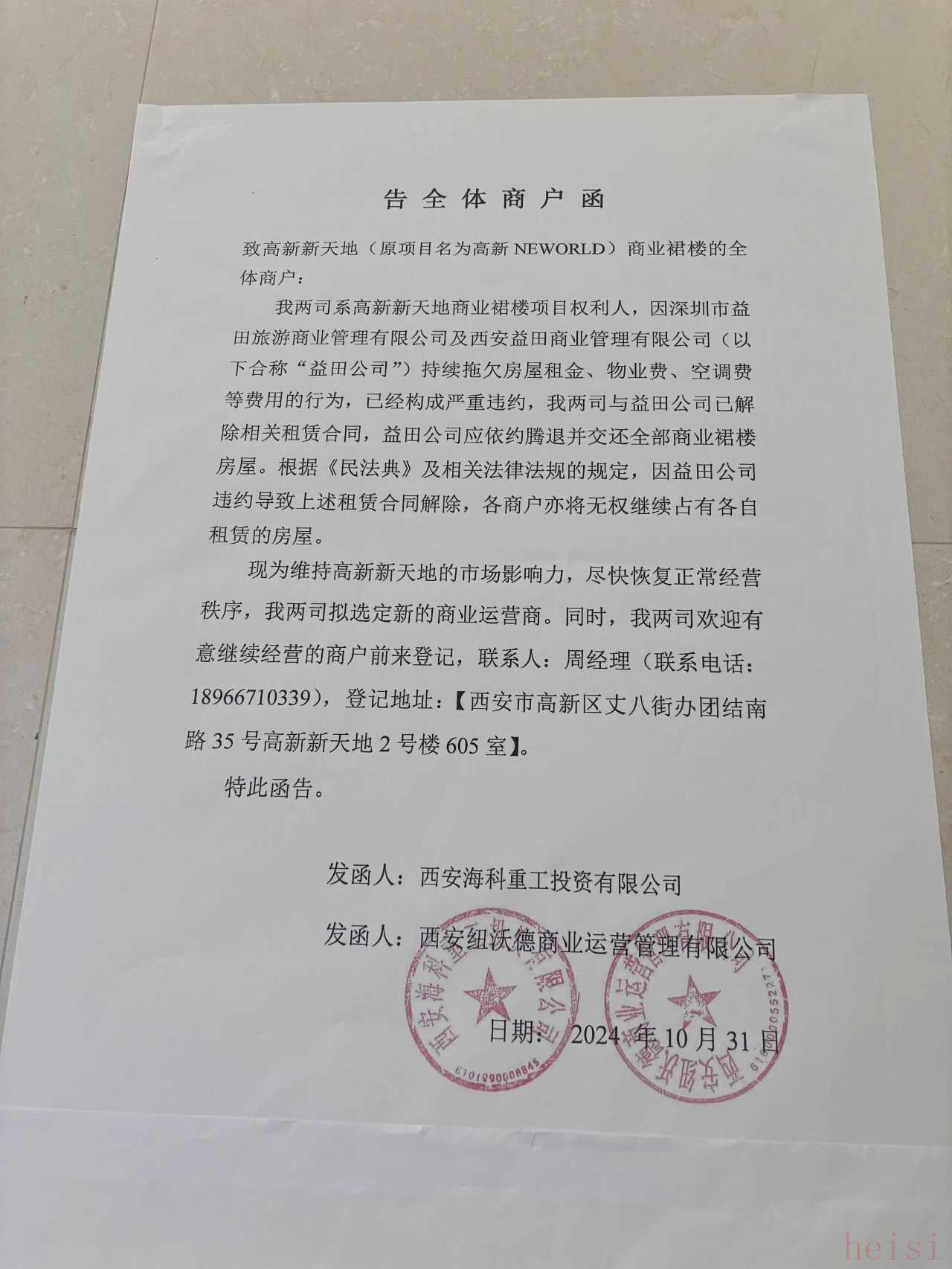 益田假日天地项目权利人西安海科重工投资有限公司(简称:西安海科)、西安纽沃德商业运营管理有限公司(简称:西安纽沃德)联合发布《告全体商户函》,明确指出西安益田及深圳市益田旅游商业管理有限公司(合称:益田公司)持续拖欠房屋租金、物业费、空调费等,造成严重违约,目前已与益田公司解除相关租赁合同,益田公司应依约腾退并交还全部商业裙楼房屋。