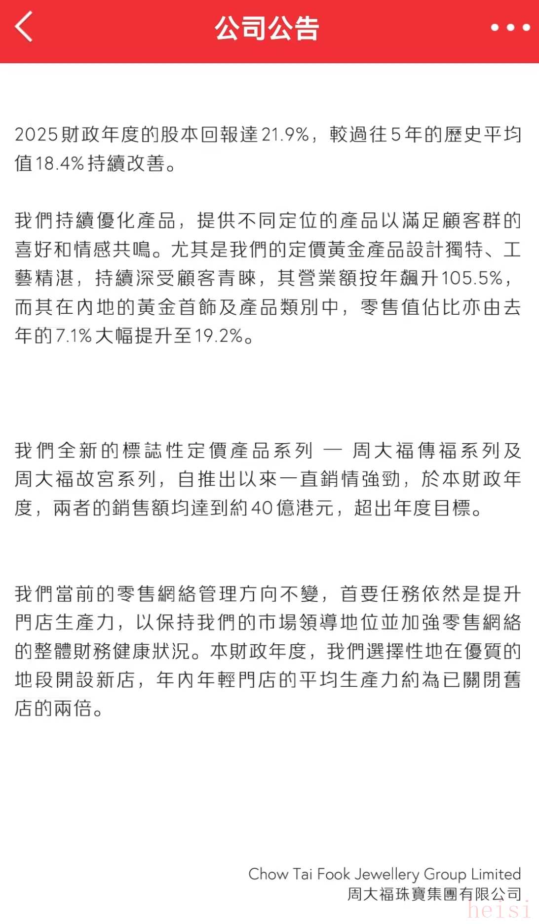 记者在周大福发布的截至2025年3月31日止的全年业绩公告上可见,定价(一口价)黄金产品营业额按年飙升105.5%,内地市场零售值由去的年的7.1%升至19.2%。其“明星”定价产品:传福、故宫系列,两者销售额均达到约40亿港元,超出年度目标。