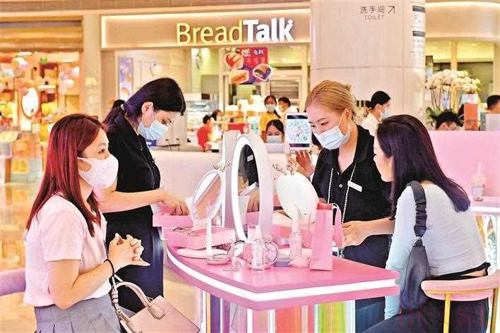 市民在福永益田假日天地化妆品店铺试妆。