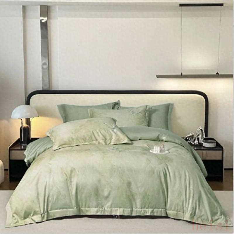 天青烟雨系列围绕“舒适睡眠场景”打造,配色与质感呼应“轻法式”“现代简约”等主流卧室风格。选用浅薄荷绿与柔和奶杏色等低饱和色调,灵感源自“晨间林雾与新绿”,既保留自然清新,亦契合现代家居的简约柔和。采用天丝棉柔滑面料,结合“轻刺绣+晕染纹理”工艺,模拟“织物的呼吸感”,在满足裸睡亲肤需求的同时,以细腻纹理再现“植物肌理的朦胧美”。设计以“现代极简卧室”为基调,融入中式美学中的“留白”与“写意植物”元素,平衡都市生活的简练与自然疗愈的松弛。