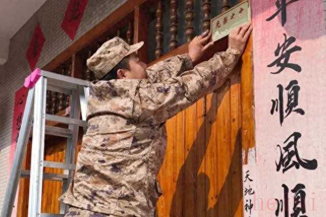 好的位置只是第一步。“光荣牌”挂的高度也有标准。一般在离地2到5米间,不低不高。牌子挂太高看不清,太低又不显气派。牌子需要挂得正、不歪,像每一家对军人身份的肯定。