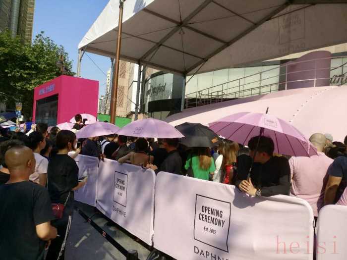 八月份炙热的三伏天里,上海淮海路连卡佛门口人头攒动,透过拥挤的人群,可以看到同为粉色的围栏和LED屏幕——好像放在马路上的一块大蛋糕。甚至,就连一众黑色制服的安保人员,举着的都是粉色的遮阳伞。