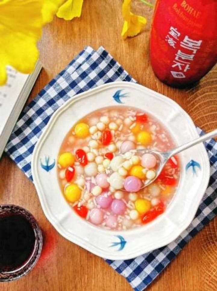 5. "小点心:" 几块韩式年糕 (Patjuk)、烤红薯片、或者简单的坚果碎