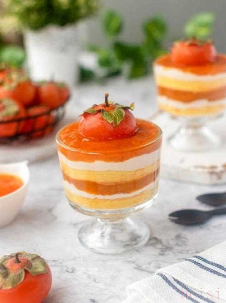 厨友@烟火间 用这款柿子酒创作了精致的周末下午茶点,还未入口,满眼就已是秋日氛围:“周末了,下午茶来点微醺感。松软轻盈的戚风蛋糕,搭配酒香柿子酱和奶油,层层堆叠出一款既有颜值、又有灵魂的秋日蛋糕杯~”