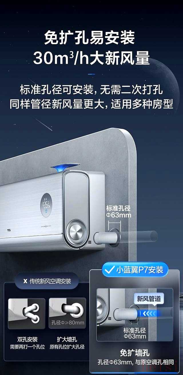 P7适合谁?装修完急着住、租房不想打墙、家里有娃有宠。安装师傅上门不用再打孔,原孔位直接挂,省下一笔墙面修复费。风量每小时60立方米,客厅30平米,一小时换气两次,噪音最低18分贝,比冰箱运转声还小。CO₂传感器藏在机身里,人多聚会时自动加大新风,人少时减小风量,省电不省健康。十年整机包修,折算到每天不到一块钱,很多人算完这笔账当场下单。