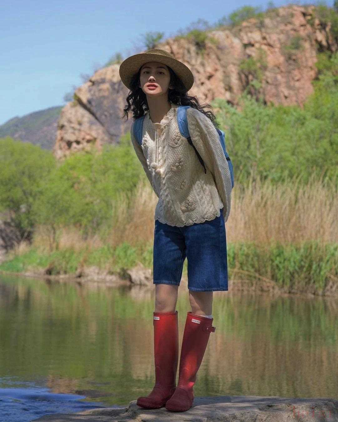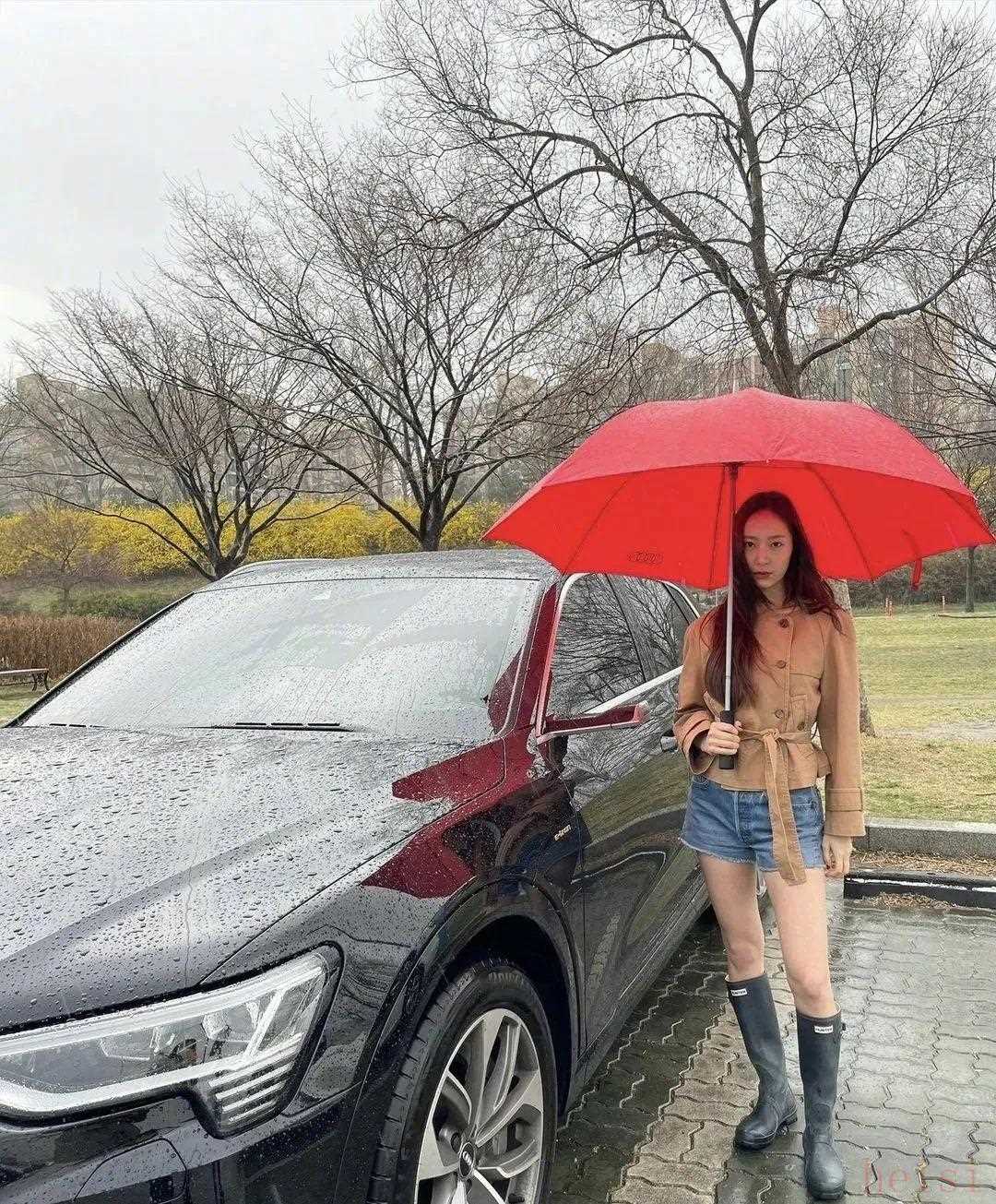 郑秀晶的这张雨天造型街拍,长袖外套搭配牛仔短裤,脚下一双Hunter雨靴拉长腿部线条,红雨伞的加入更是营造了一种电影的氛围感。