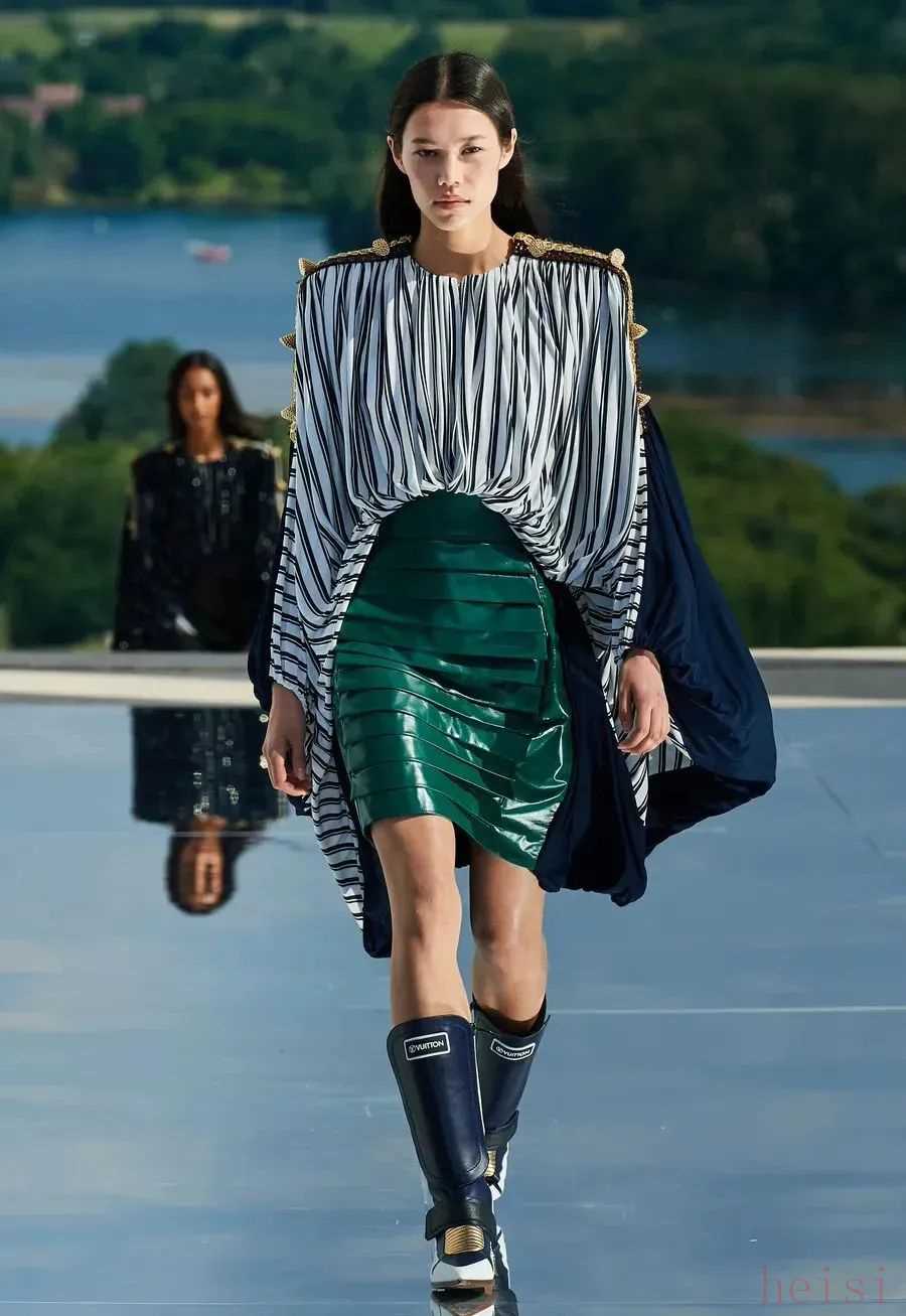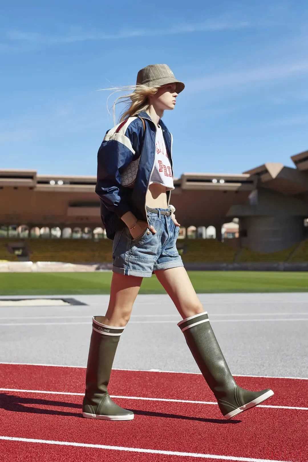 即使没有了高跟鞋,脚踩雨靴的模特们也能将女孩的青春与自信展现得淋漓尽致。搭配短裤或裙装的雨靴穿搭,也成为了本次秀场上的热门话题,绿、蓝配色以及半筒和长筒两种高度的设计,让CELINE雨靴在搭配上有了更多的可能性。
