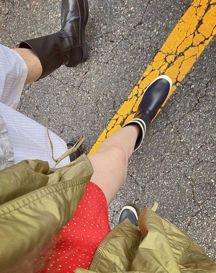 同样是红色,但泫雅将其穿在了身上。少女红裙搭配Celine海军蓝雨靴,泫雅的这组雨靴照不知又让多少人被种了草。前脚窄的中筒Celine雨靴,完全没有了雨靴一贯的笨重感,搭配裙子简约百搭,还是显腿细的好帮手。