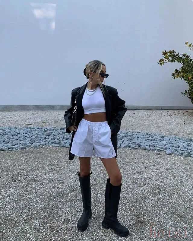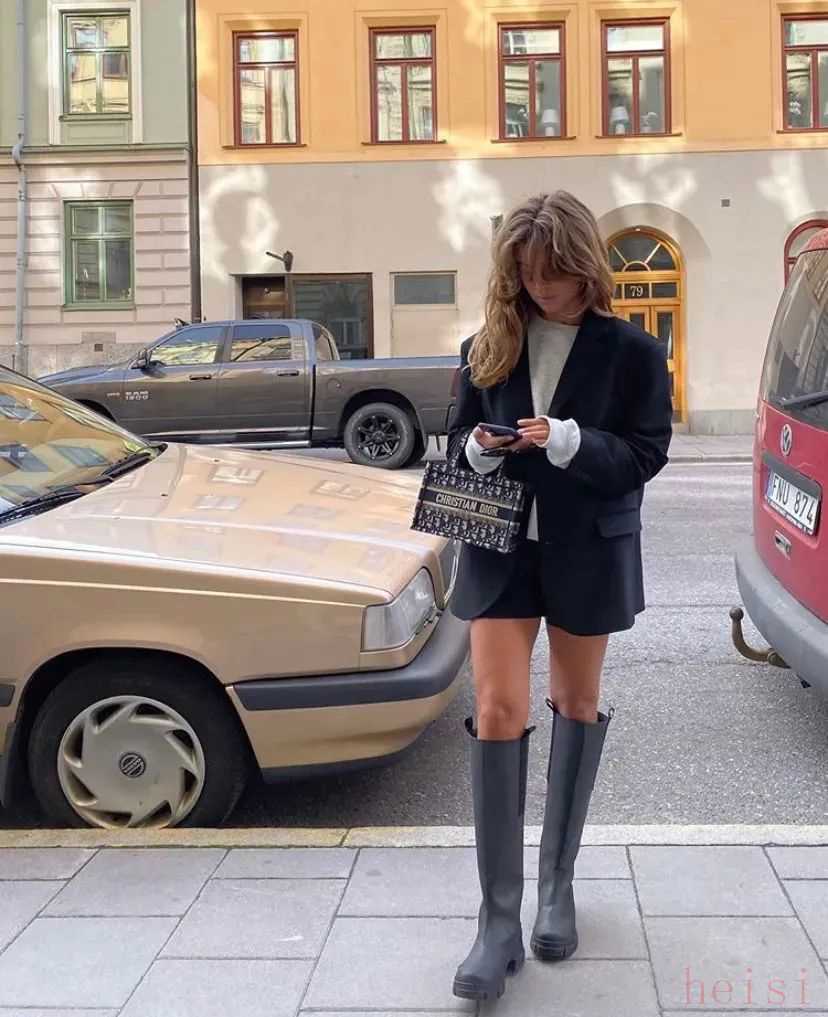 搭配短裙或短裤是最不容易出错的一种雨靴穿搭方式,选择高腰宽松直筒的裤型设计,搭配高筒雨靴,简直就是遮肉满分穿搭。