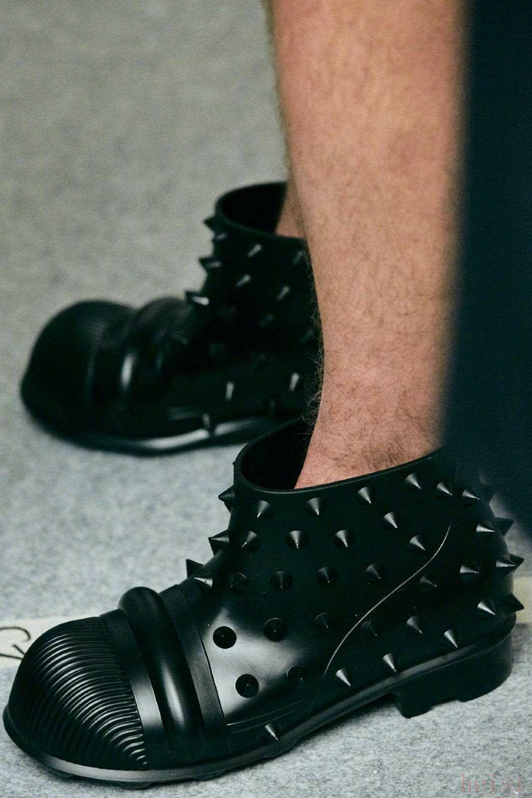 在Loewe 2022秋冬男装秀场上,Jonathan Anderson越玩越嗨,不仅有满目的大型旗帜飘带,还有在LED灯照亮下的橡胶雨靴,铆钉状的外形尽显趣味~