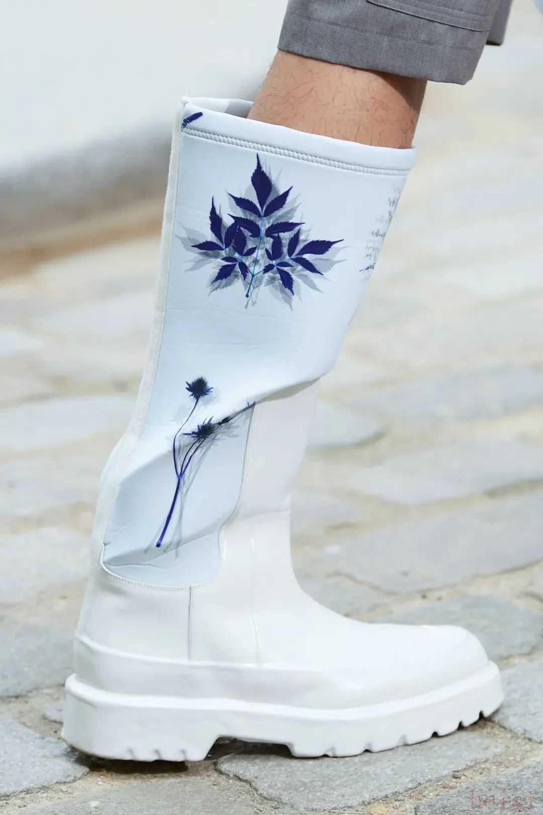 而在此之前,Louis Vuitton曾为雨天专门推出过一个Rain系列,将许多原本经典的鞋型改造成了 PVC 材质,这其中也包括高跟鞋和运动鞋。在2020春夏男装系列中,艺术总监VIRGIL ABLOH就曾推出过一款以Louis Vuitton经典HARLEM短靴为设计灵感而全新打造的纯白雨靴款式,搭配廓形感风衣十分有型。