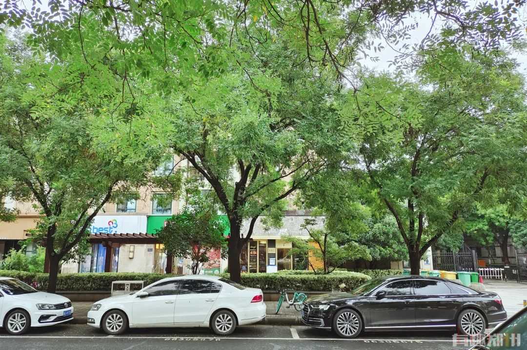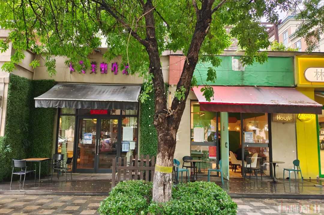 街道上树木成荫,深深浅浅的绿色夹杂在一起形成一条绿色的连廊;两侧的商铺琳琅满目,五颜六色的门头给大片的绿色增添了点点彩色的光晕。