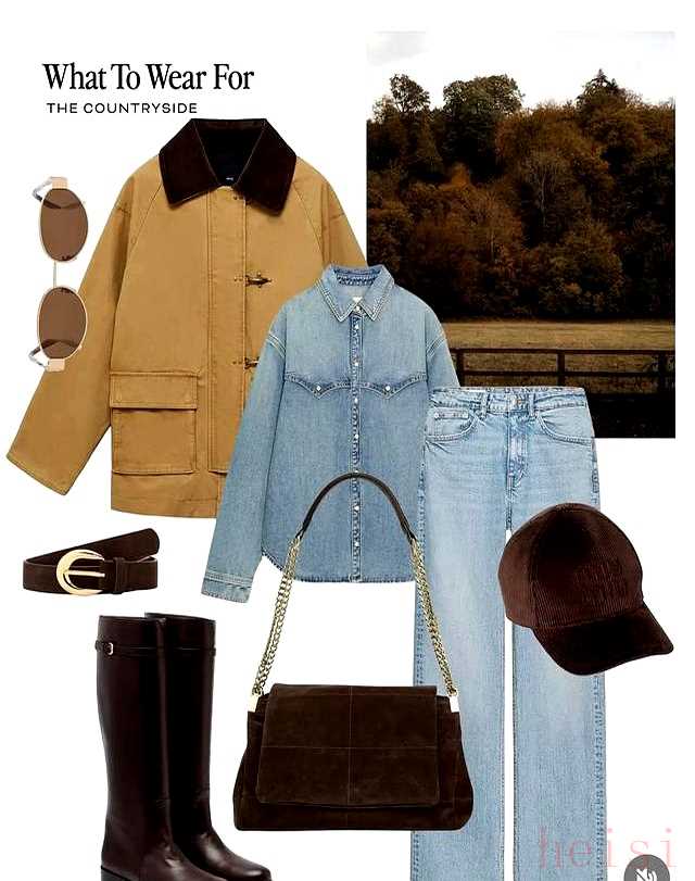 一件巴恩风外套,咖色双兜,做旧牛仔,配一双巧克力厚底雨靴。