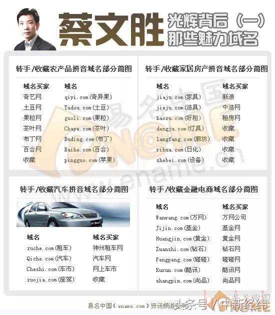 蔡文胜是国内最成功的域名投资者之一,据易名中国,蔡文胜注册拥有多个农业相关域名,且一些域名已被知名网站启用,如百度旗下独立视频网站奇艺网(后更名为爱奇艺)。坊间传闻,当初蔡文胜注册该域名是以农业水果奇异果的“奇异”二字来注册的。还有知名视频网站土豆网站tudou,该域名也系蔡文胜以农业产品名字来注册,交易价格也不菲。目前为止,蔡文胜已转手卖出多个汽车类域名,如神州租车网zuche域名,汽车网的Qiche、 网上车市的Cheshi等;在金融电商行业域名上,Jijin(基金)、Huangjin(黄金)和Zuanshi(钻石)等,都已被启用建站,且在国内都有一定知名度。