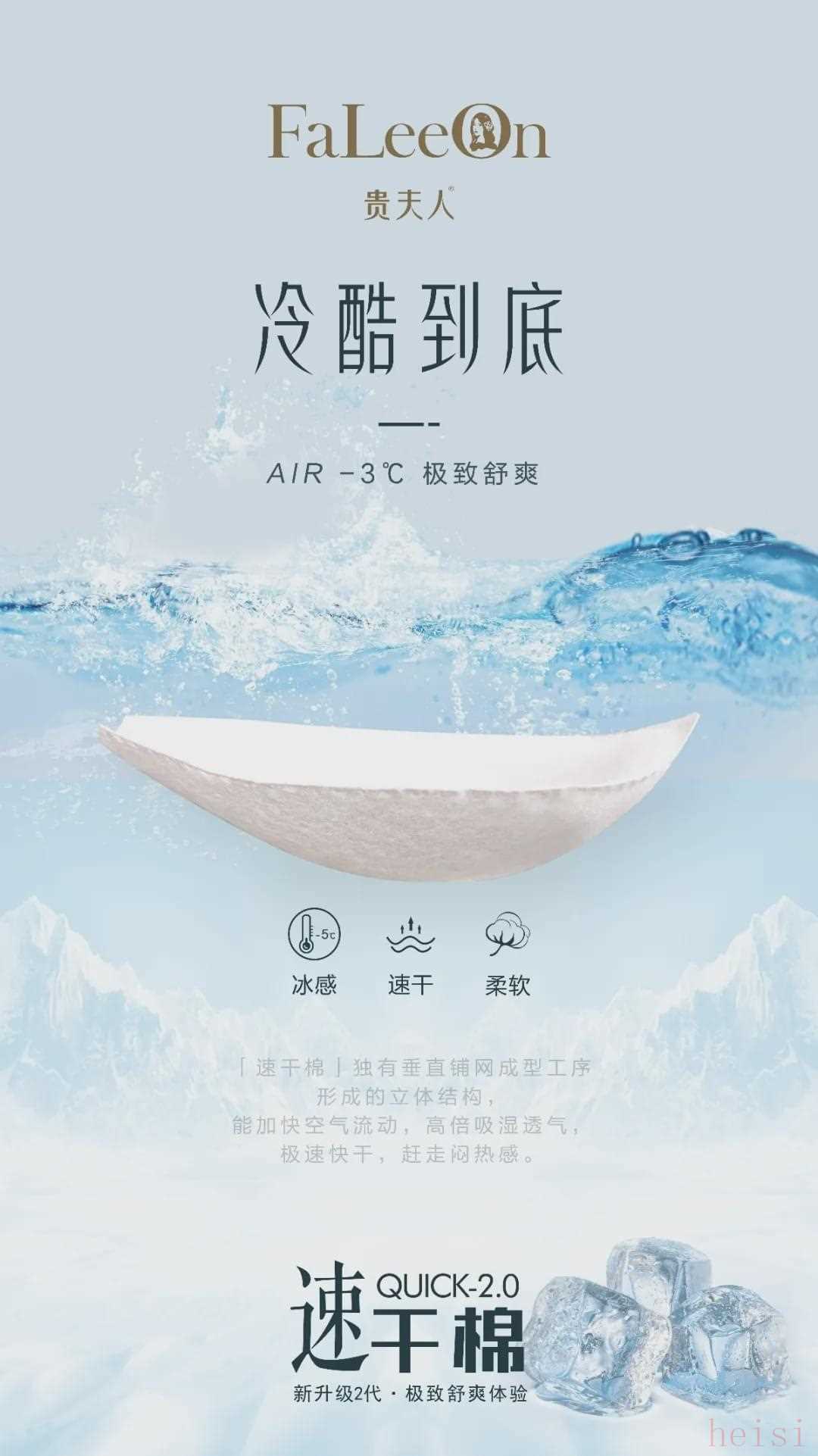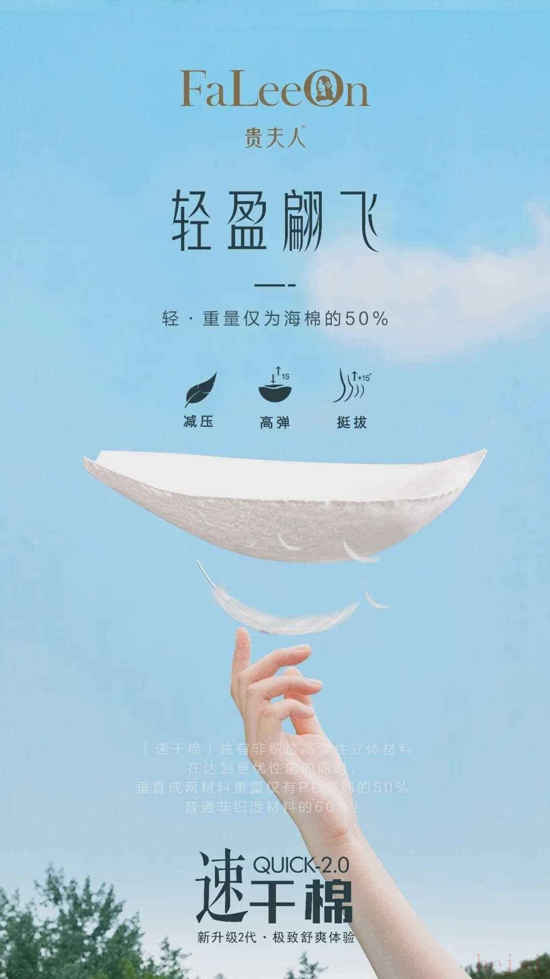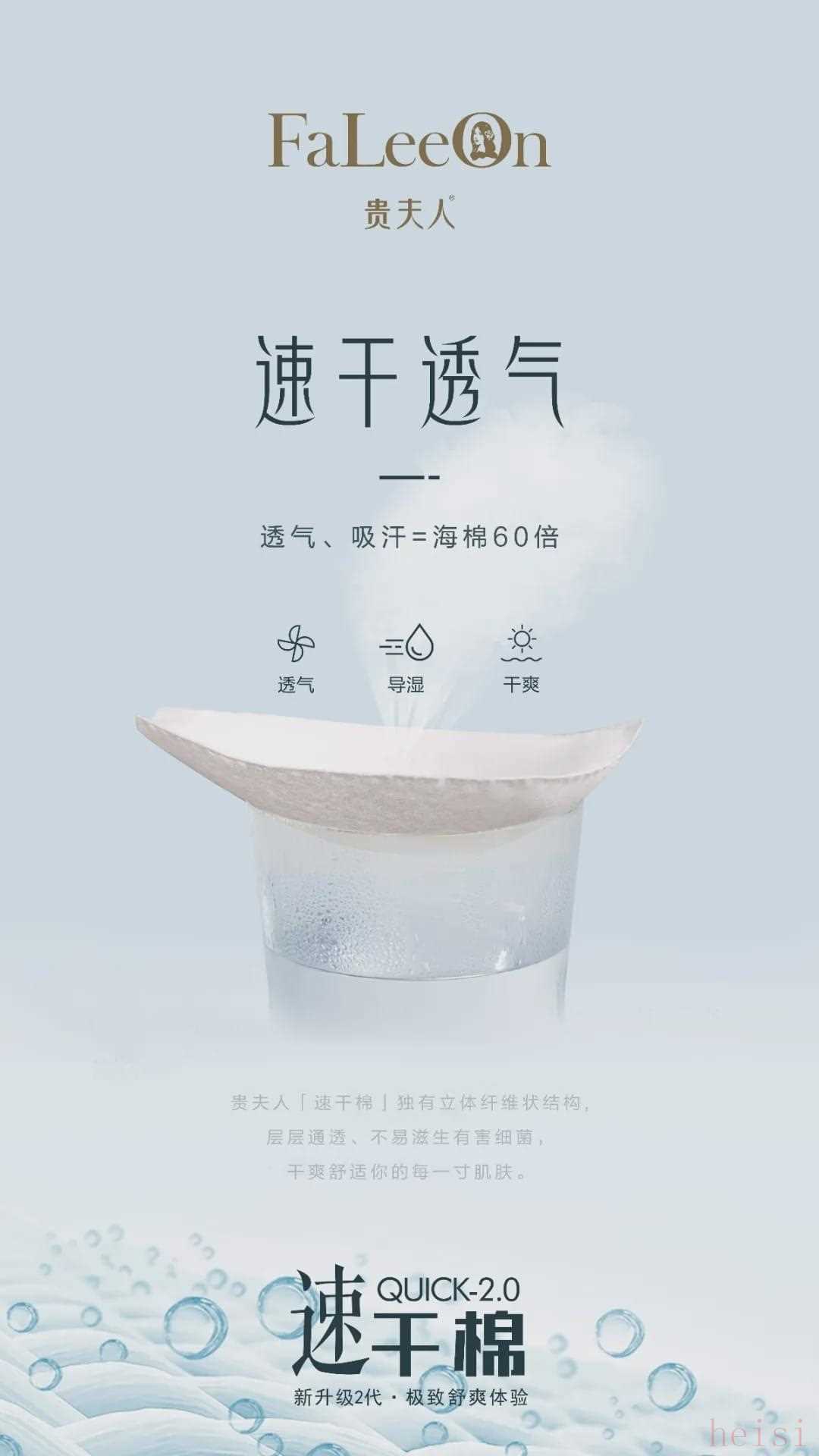 贵夫人速干棉采用独有的垂直铺网成型工序形成的立体结构,加快空气流动,高倍吸湿透气,含有极速快干的特色。