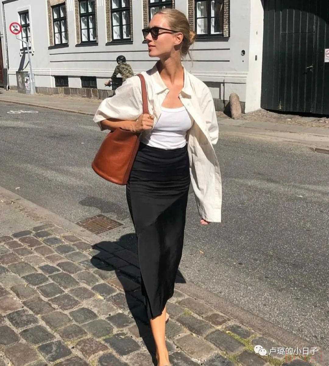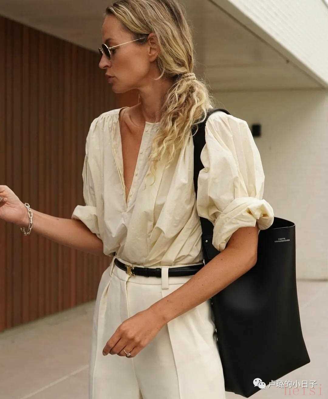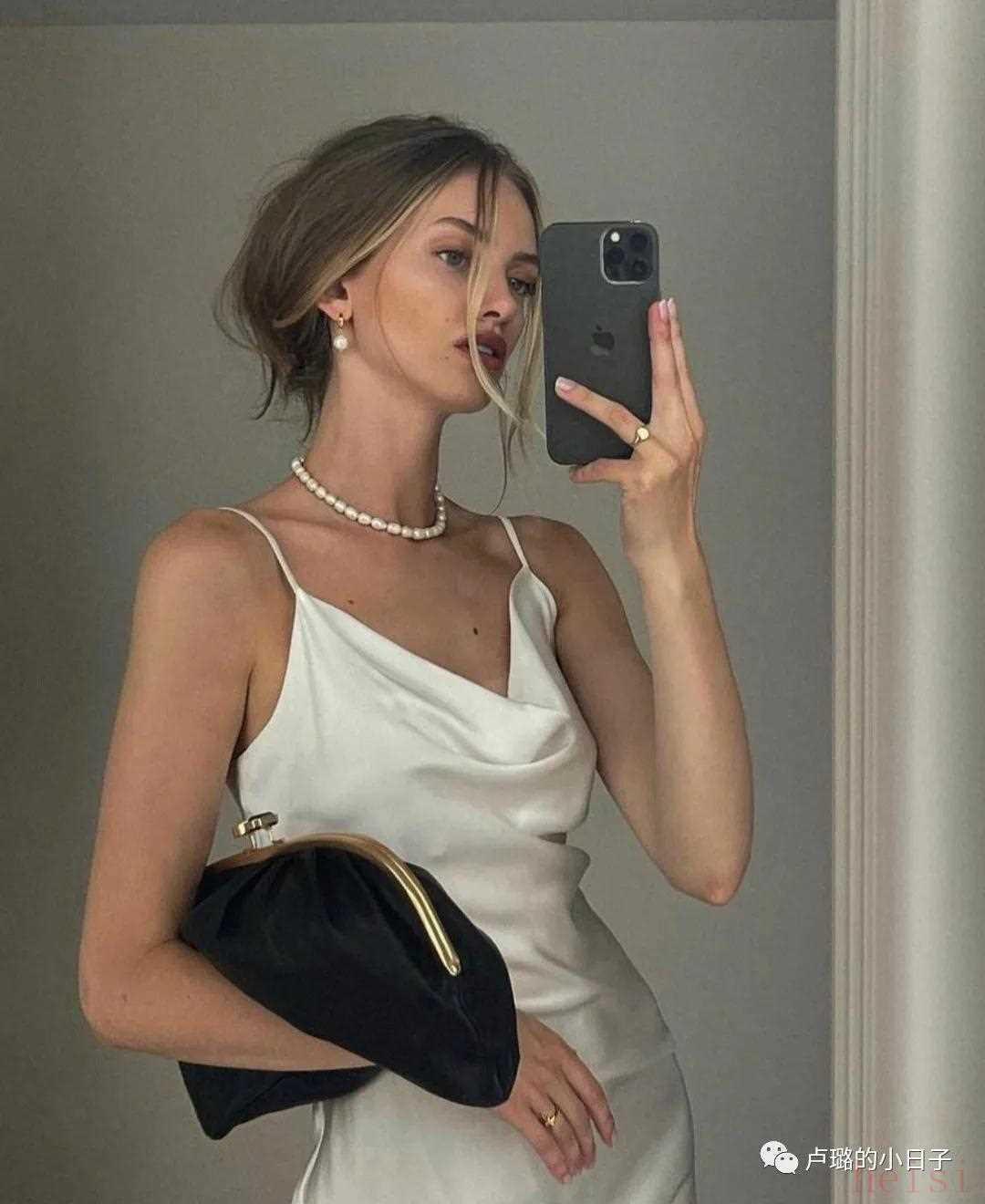 以这一套穿搭为例,白色丝绸吊带搭配黑色手拿包,其实已经很优雅了。