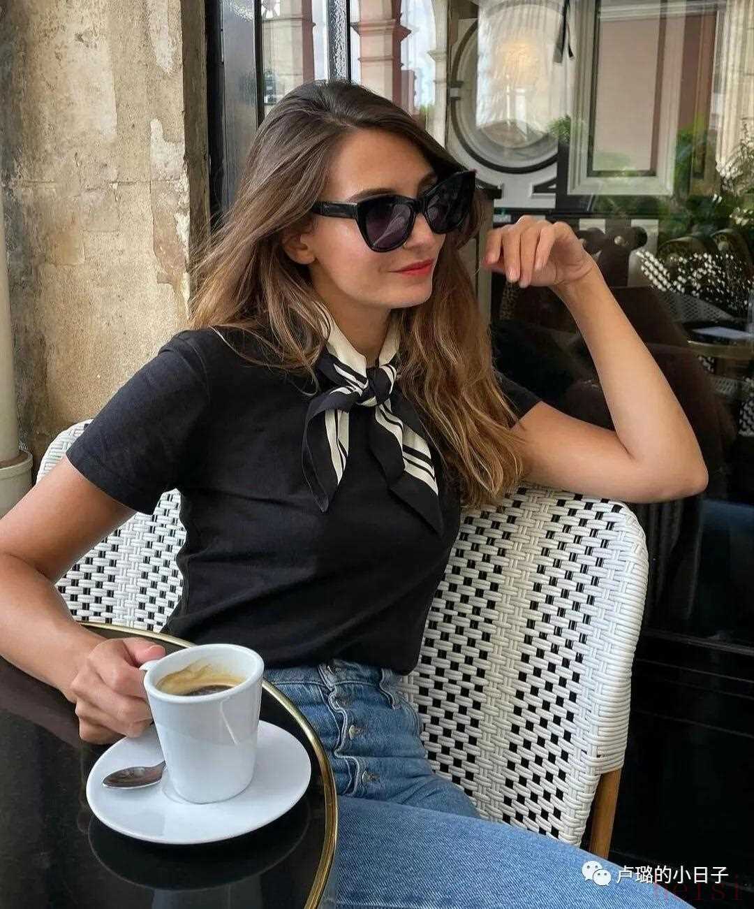 在这一套穿搭中,黑T和牛仔裤都是很普通的单品,但领口的丝巾却一下让整体变得高级起来。