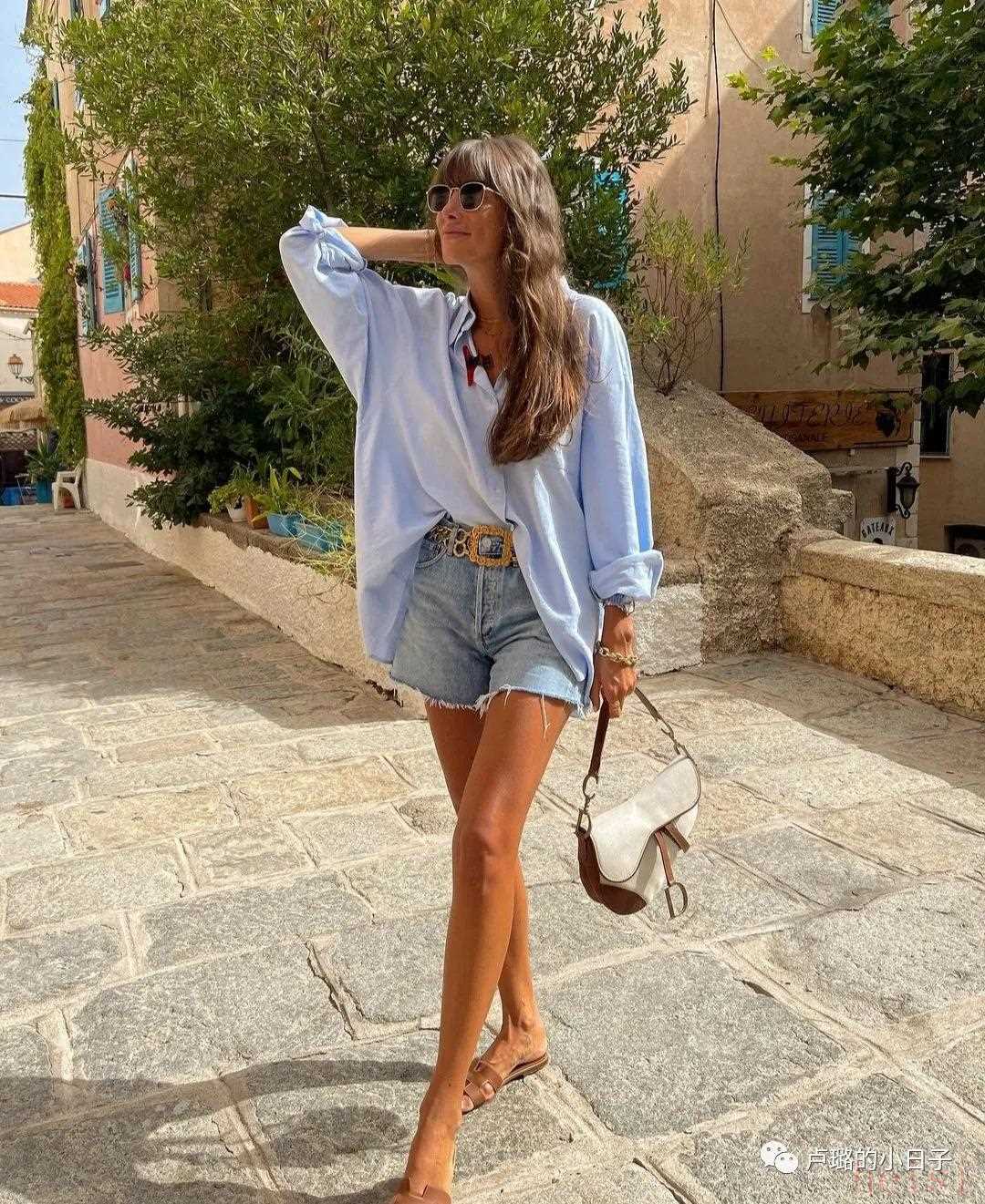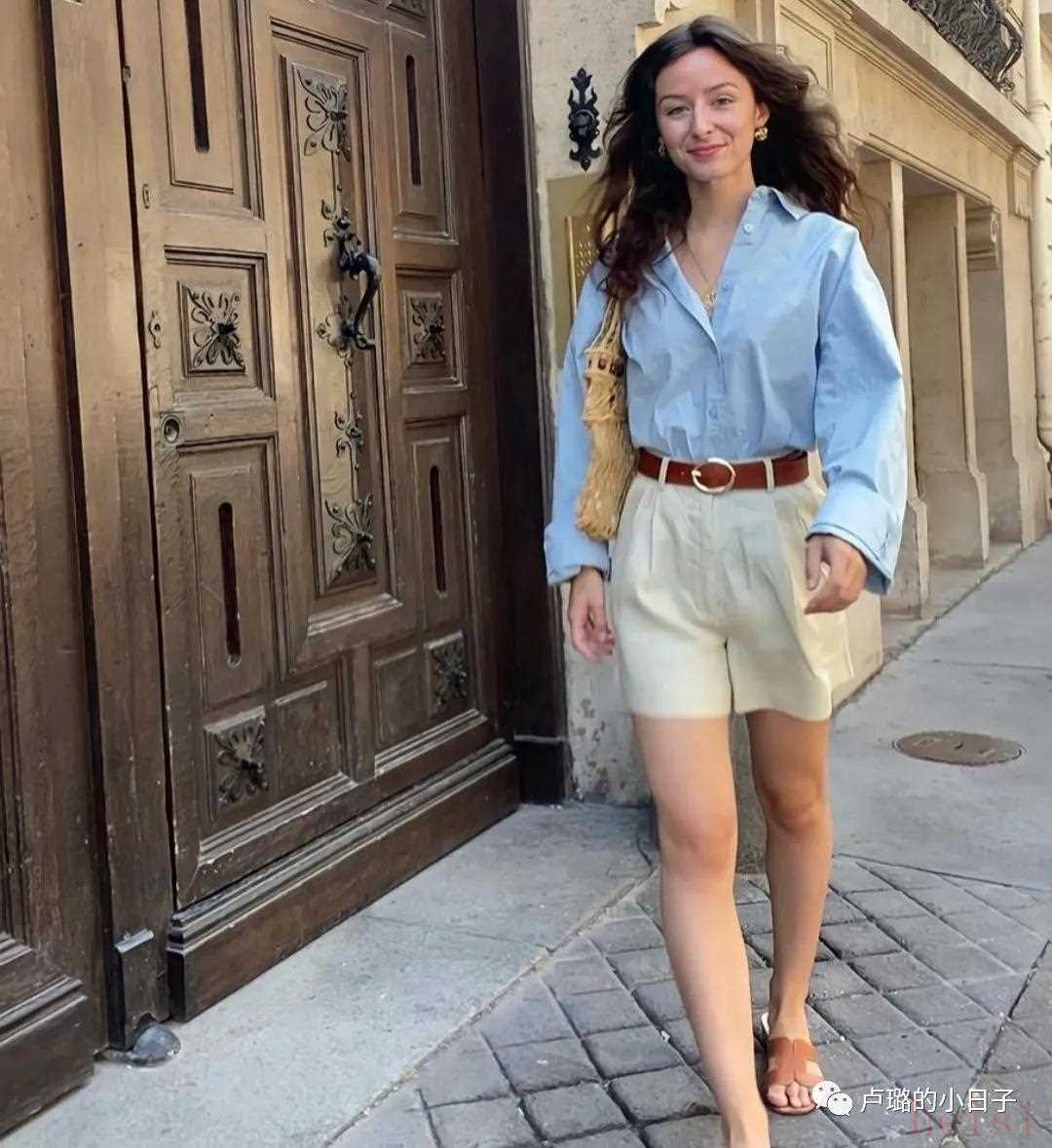 除了白衬衫,浅蓝色是她们偏爱的颜色之一,搭配一条低明度的阔腿短裤,再系上一条棕色皮带,整个人就好像沐浴在风里。
