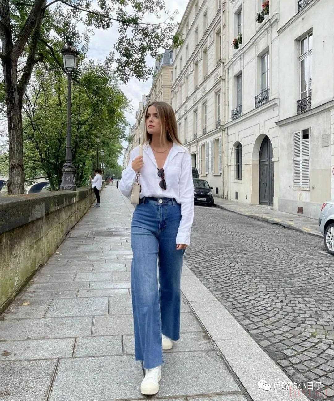 像这套穿搭,深蓝色高腰阔腿牛仔裤搭配宽松白衬衫,白衬衫凹成V领,增加了一丝慵懒感和随意感。