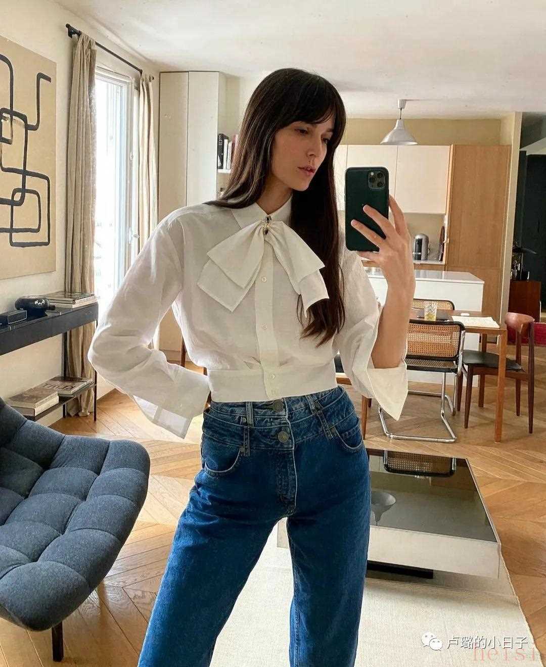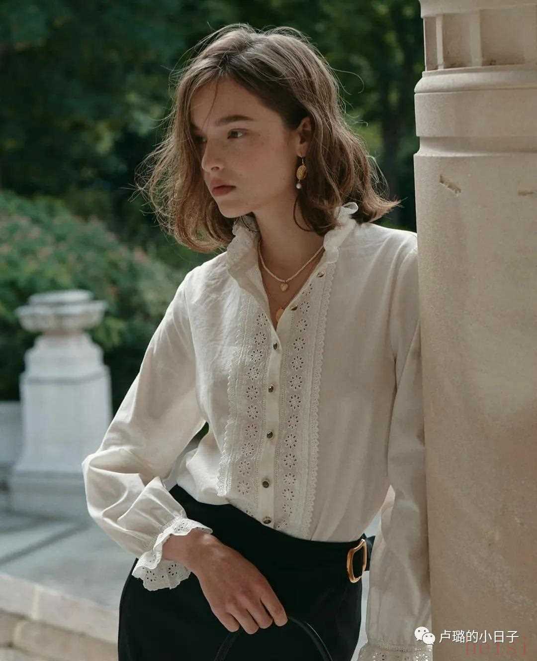 白衬衫,或许是最常见的时尚单品了,法国女人穿白衬衫时,爱把衬衫的领口凹成V领,V领可以露出修长的脖子,整个人在视觉上也会显得更高挑。