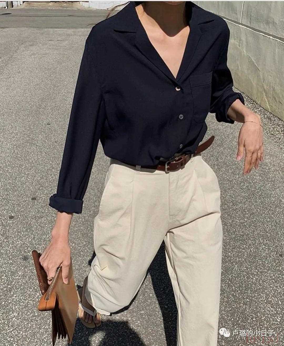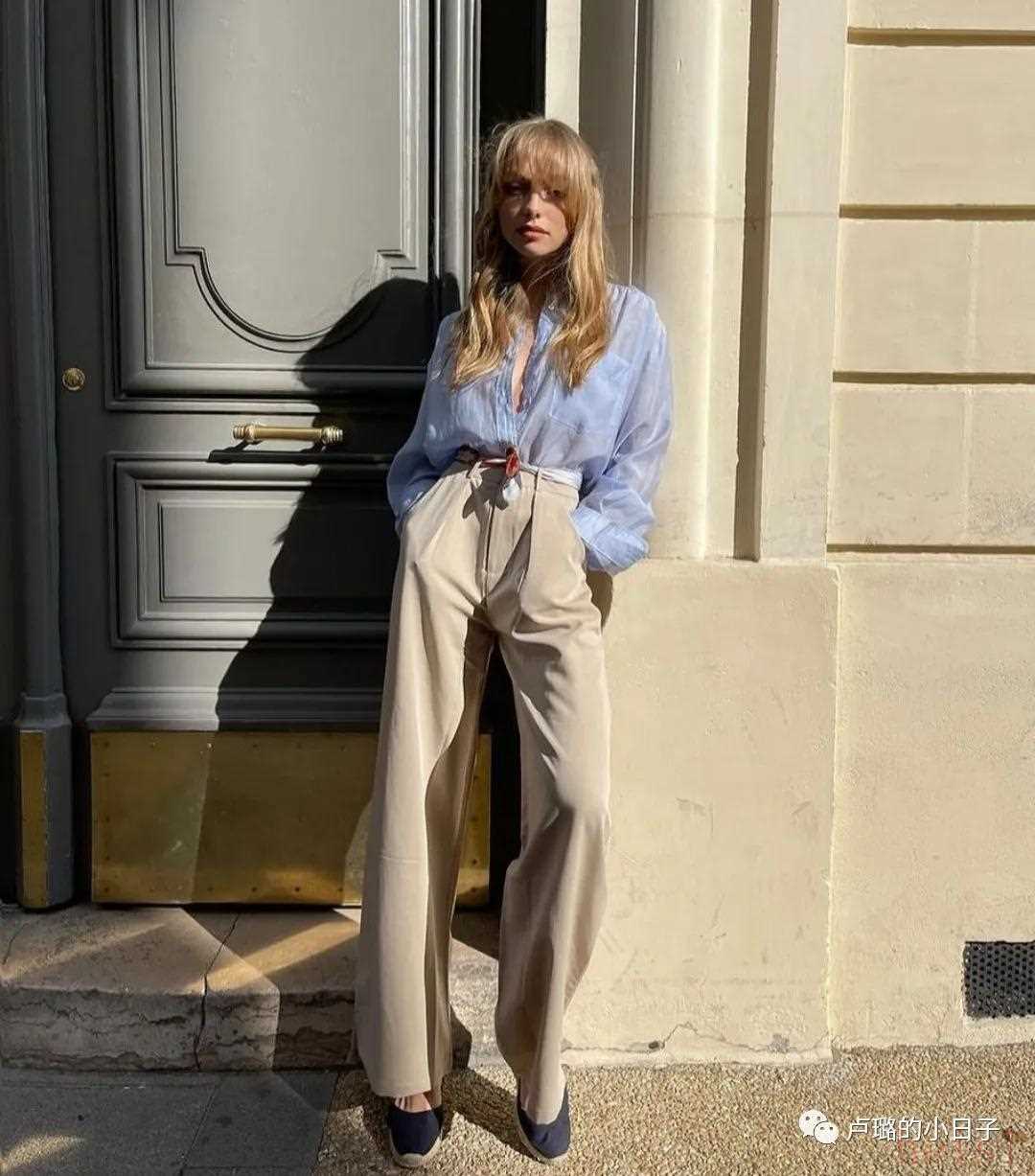 这一套穿搭,浅蓝色纱衬衫搭配杏色休闲裤,用丝带代替腰带,细节加分,整体给人的感觉就是十分舒服。