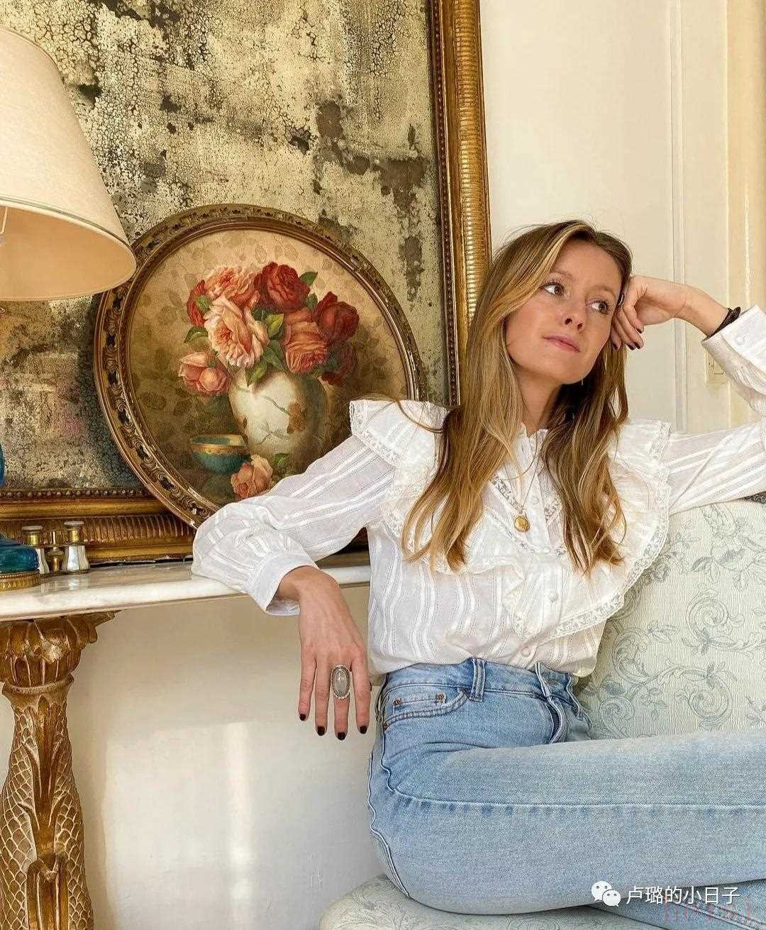 像这套LOOK,浅蓝色牛仔裤搭配荷叶边领白衬衫,面料中的白色暗纹和蕾丝的应用,增加了衣服的层次感,还显得人十分优雅,有气质。