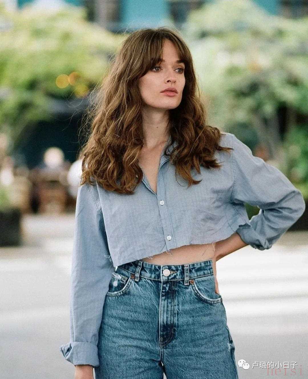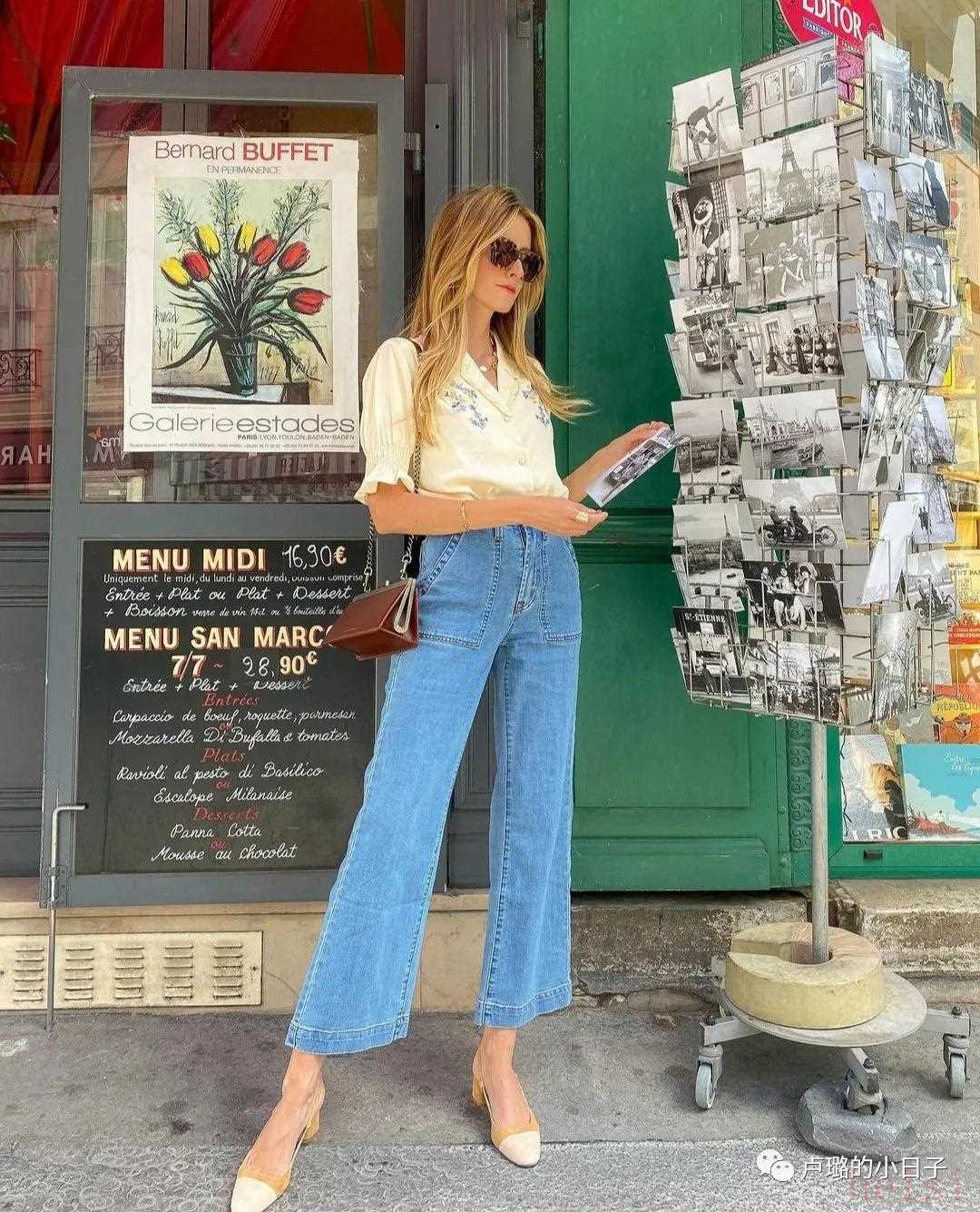 浅色的高腰阔腿牛仔裤给人的感觉会更青春、更休闲,比较适合外出游玩的时候穿。