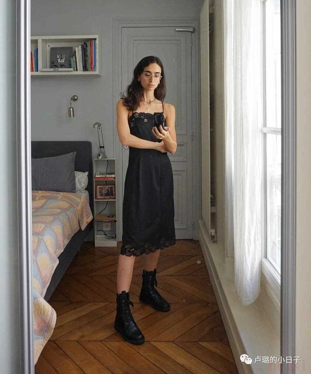 比如添加一点蕾丝,给衣服增加一些层次感,像这条黑色的丝绸蕾丝吊带裙,搭配一双高筒靴子,女人味和中性的冷感碰撞,令人印象深刻。