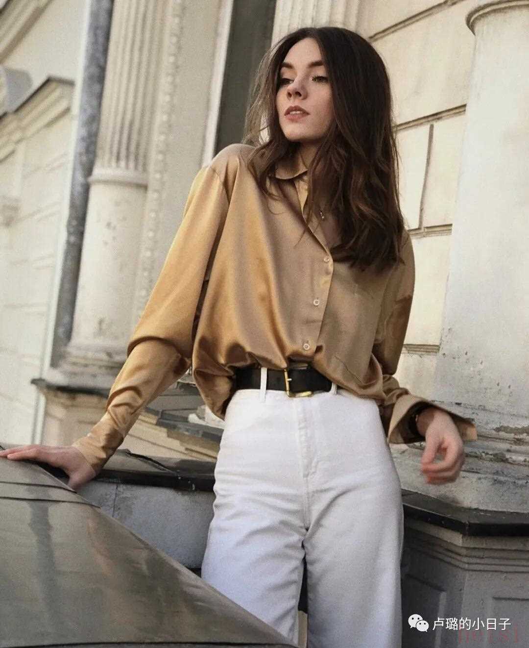 像这件暗金色丝绸衬衫,搭配白色休闲长裤,丝绸的垂坠感和低明度的暗金色,传递出慵懒随意的低奢感。
