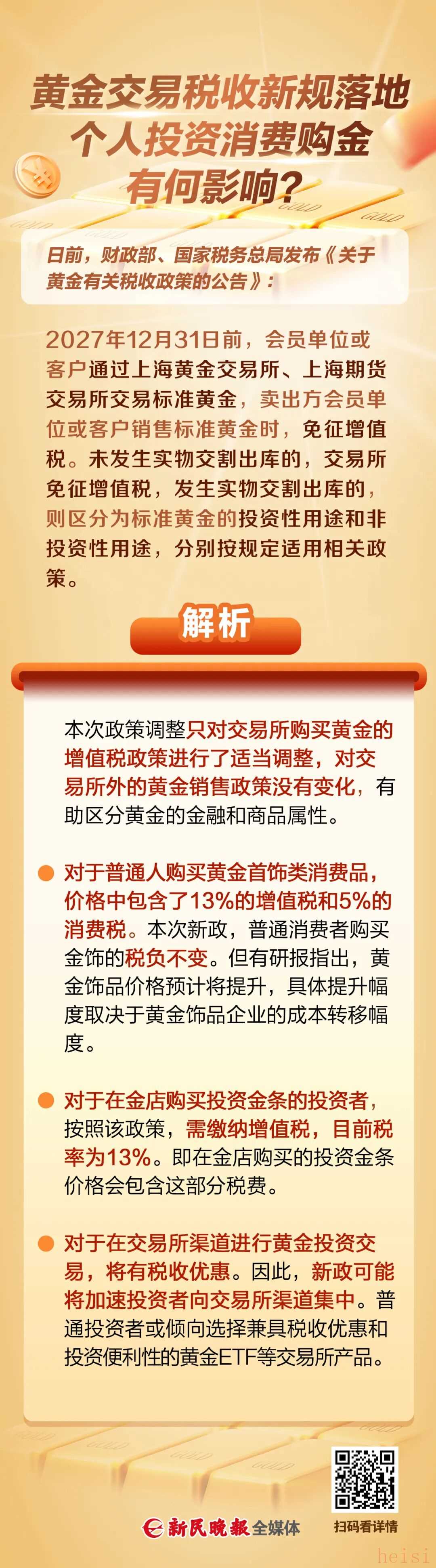 11月1日,财政部、国家税务总局发布的《关于黄金有关税收政策的公告》实施。中信建投研报认为,对于非投资类的黄金企业(如饰品、工业用途),因进项税抵扣减少(由13%降至6%),对于成本端或有所提升,结合当下金价,预计成本增加在60元/g+。